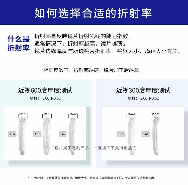 Показатель преломления линзы: 1.49 (обычный), 1,56 (тонкий), 1,61 (тонкий), 1,67 (ультра -тщательный), 1,74 (ультра -тщательный)