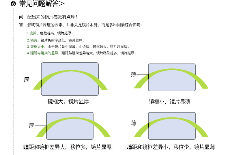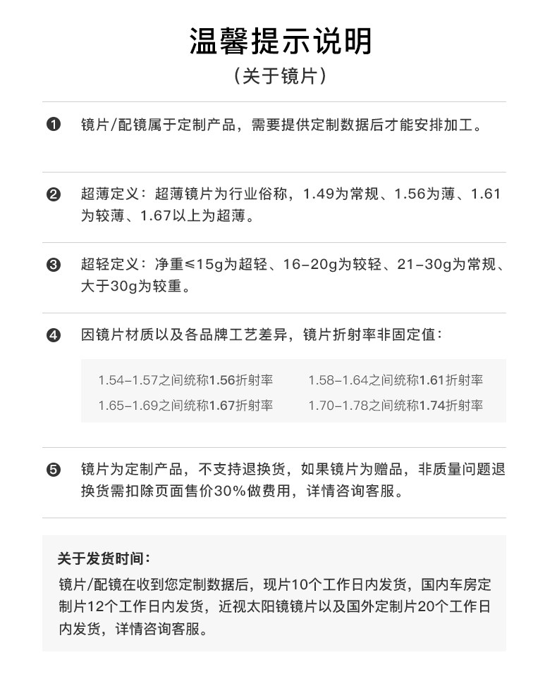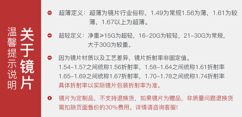 | Показатель преломления линзы: | 1.49 (обычный), 1,61 (тонкий), 1,67 (ультра -тщательный), 1,73 (ультра -тщательный) |