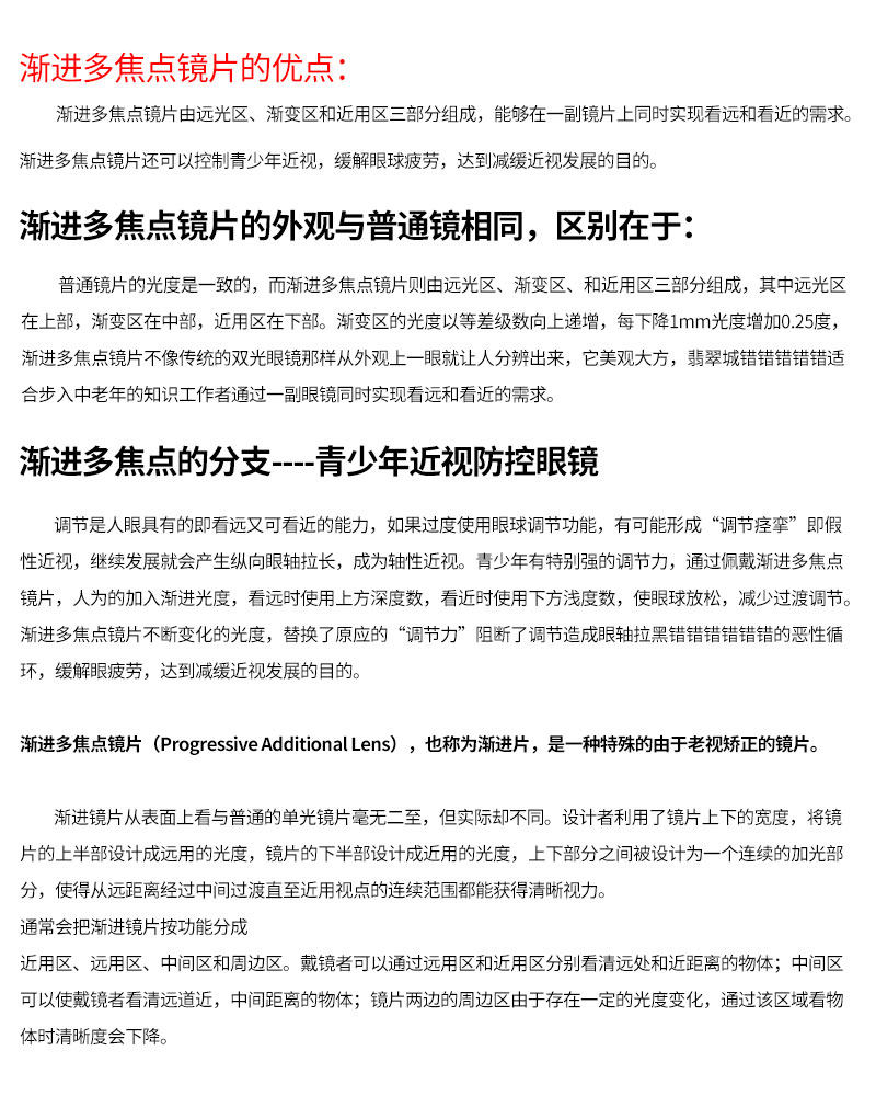 Постепенные линзы обычно делятся на функциональные участки, отдаленные районы, средние участки и прилегающие районы в соответствии с их функциями.Те, кто носит зеркала, могут взглянуть на далекие и близкие объекты через далекую область и зону, близкую к использованию; средняя область может позволить владельцу видеть объекты, которые находятся рядом и среднее расстояние; окружающая область с обеих сторон Объектив при рассмотрении объекта в этой области, ясность уменьшится.