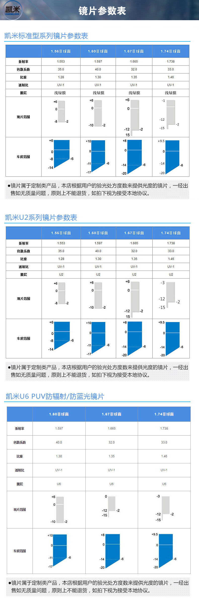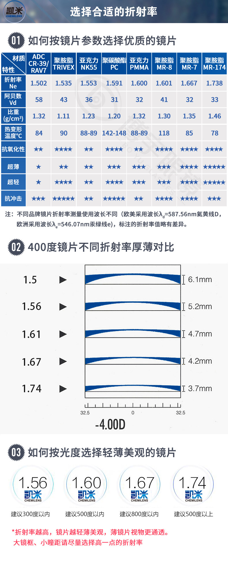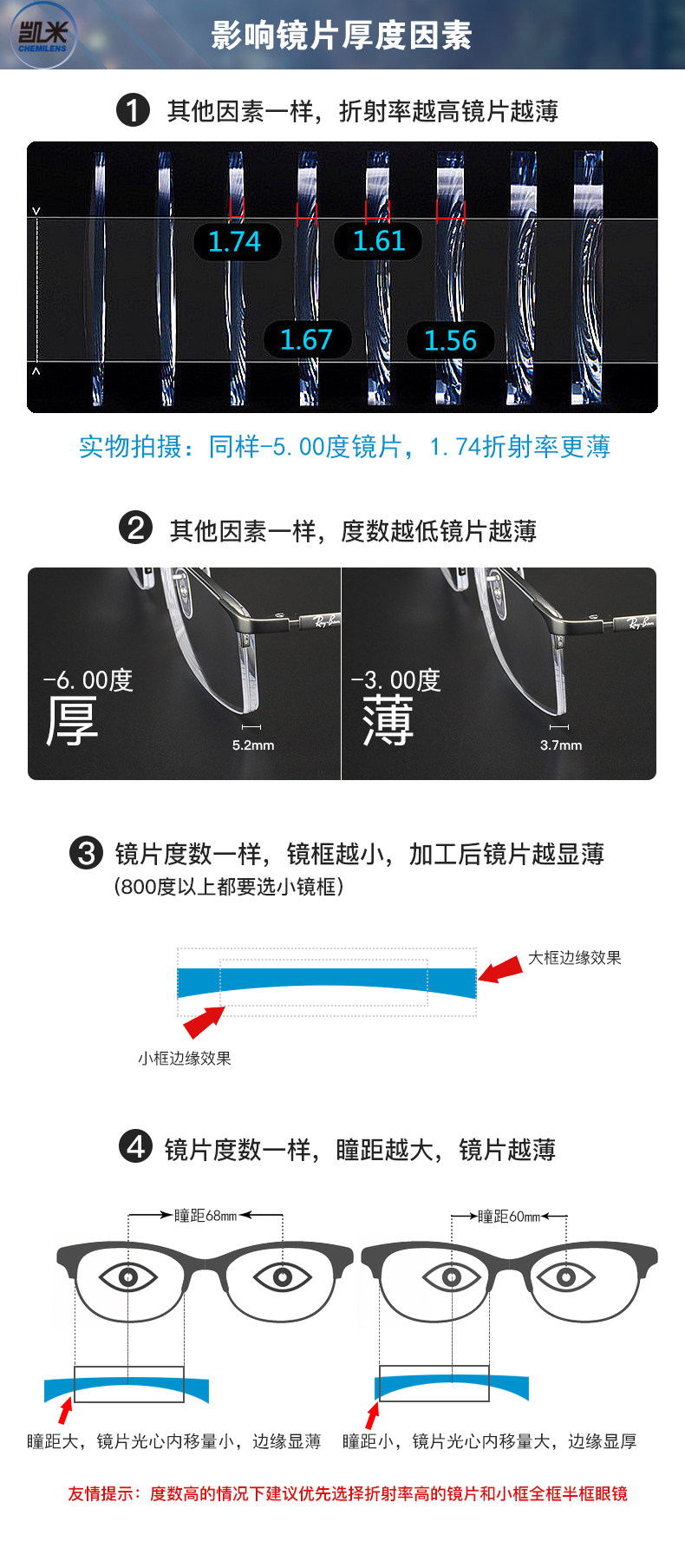 | Показатель преломления линзы: | 1,56 (тонкий), 1,60 (тонкий), 1,67 (ультра -тщательный), 1,74 (ультра -тщательный) |