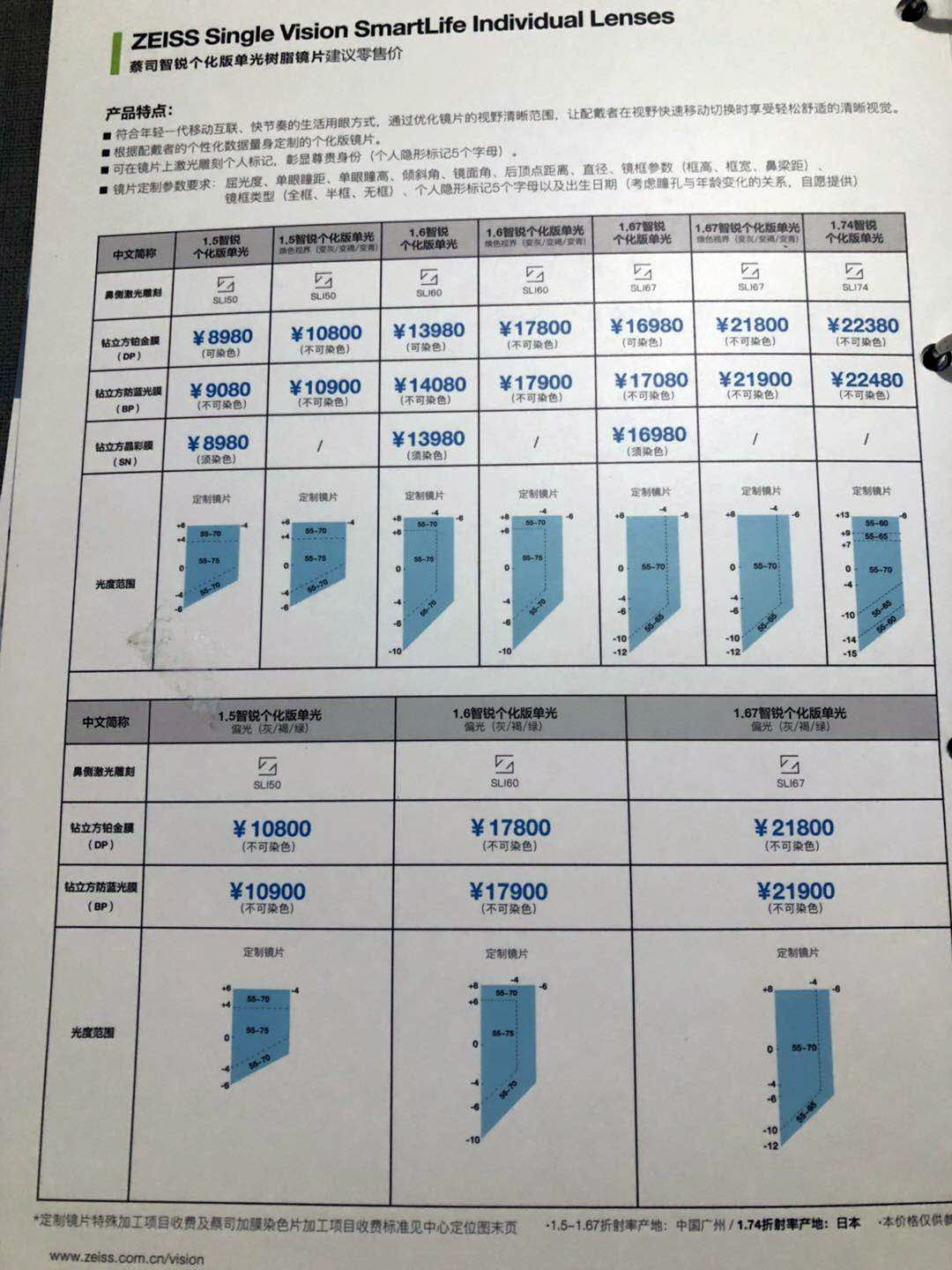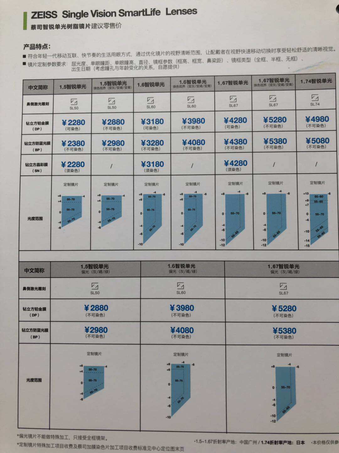 | Показатель преломления линзы: | 1.50 (обычный), 1,60 (тонкий), 1,67 (ультра -тщательный), 1,74 (ультра -тщательный) |