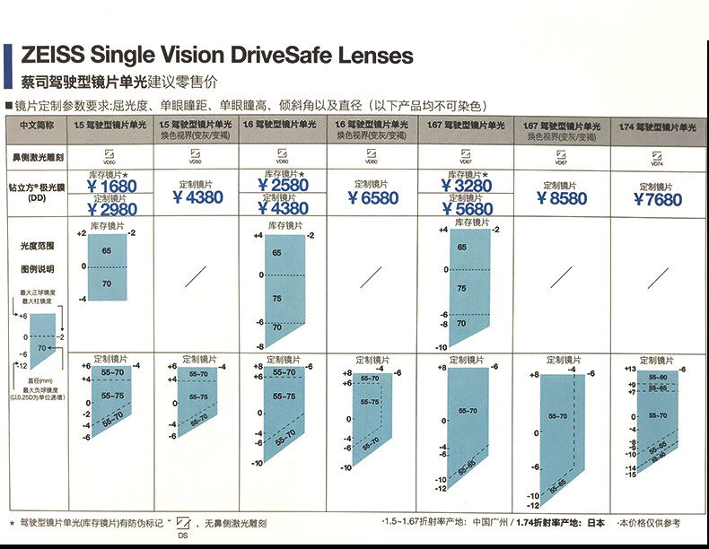 | Показатель преломления линзы: | 1.50 (обычный), 1,60 (тонкий), 1,67 (ультра -тщательный), 1,74 (ультра -тщательный) |
