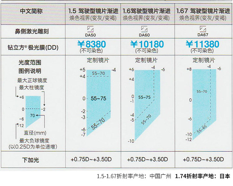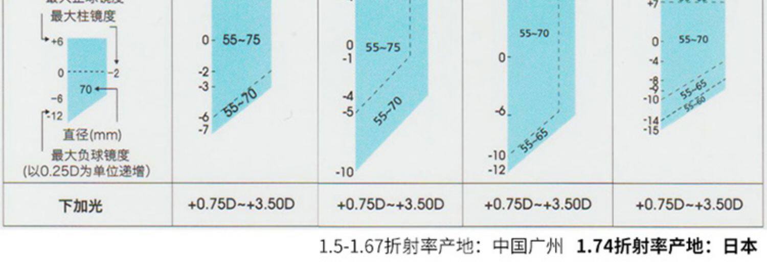 | Показатель преломления линзы: | 1.50 (обычный), 1,60 (тонкий), 1,67 (ультра -тщательный), 1,74 (ультра -тщательный) |