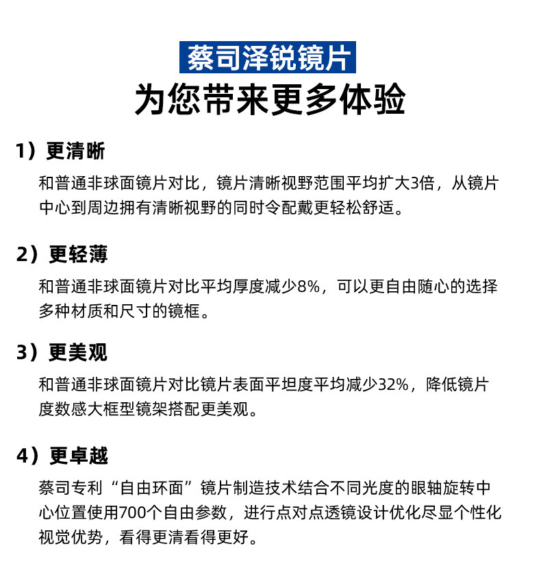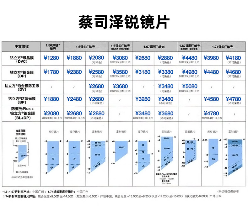 | Показатель преломления линзы: | 1,56 (тонкий), 1,60 (тонкий), 1,67 (ультра -тщательный), 1,74 (ультра -тщательный) |