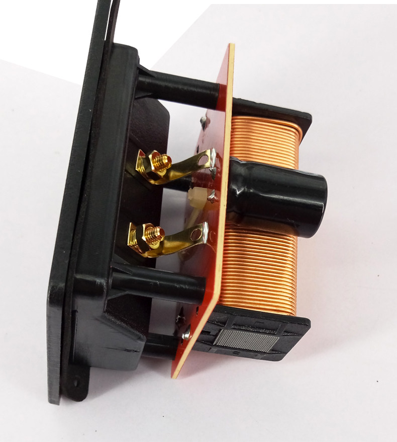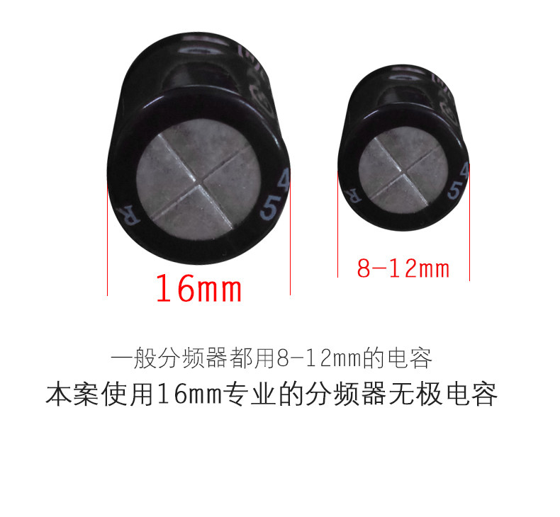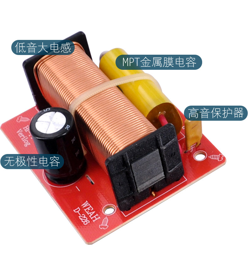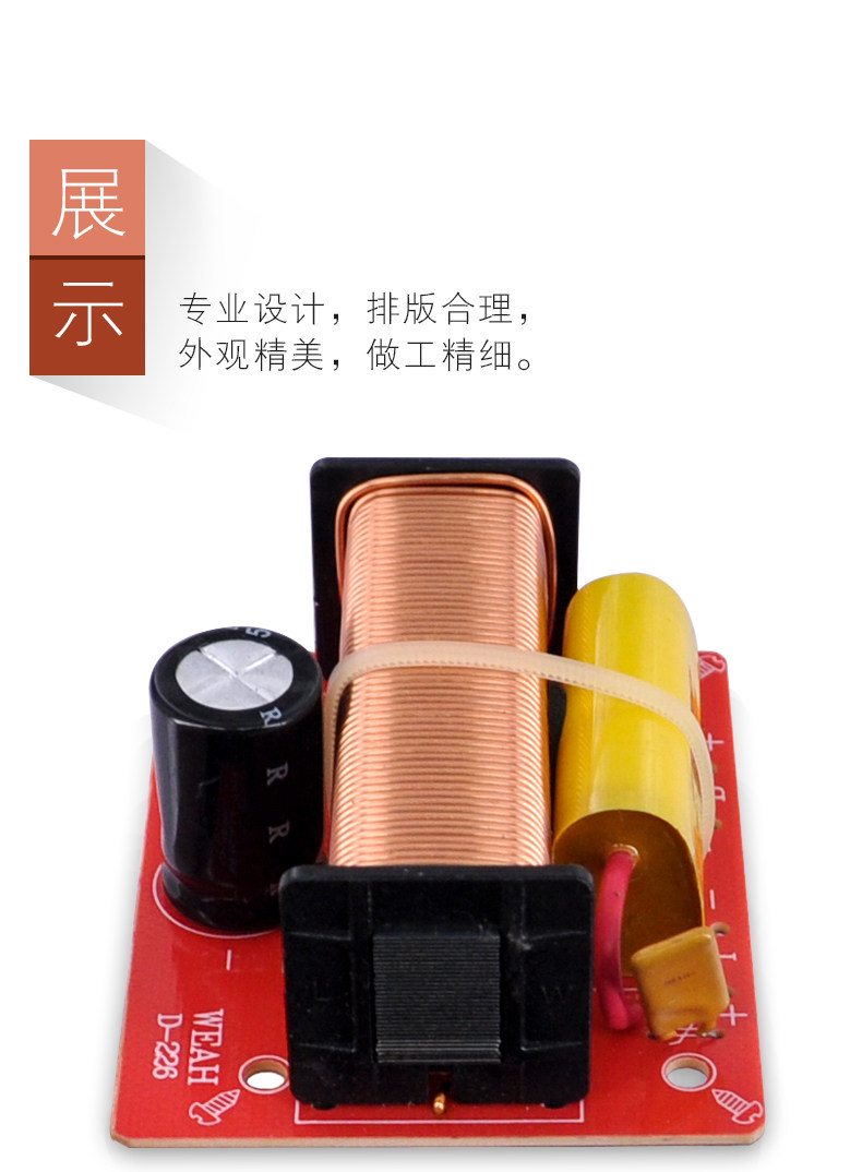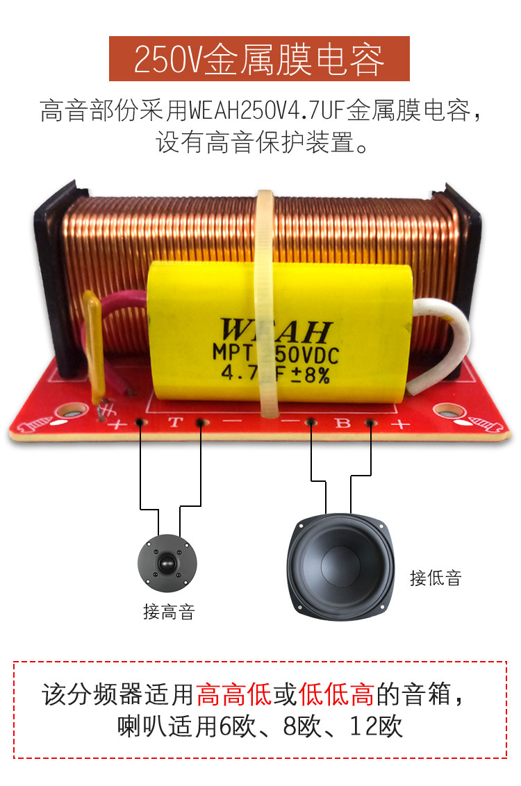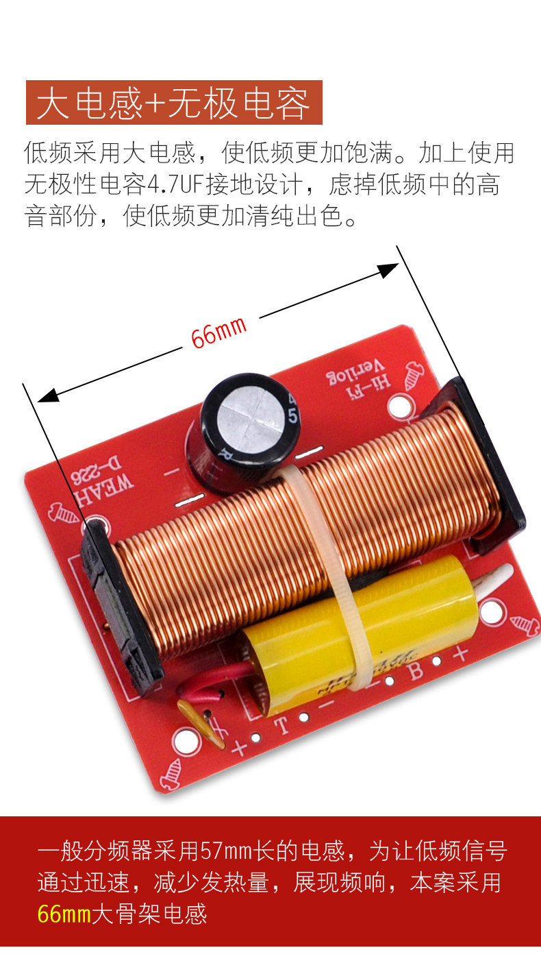 &[nbsp; 高音部份采用WEAH250V4.7uF金属膜电容,低频采用大电感,使低频更加饱满,加上无极性电容4.7uF虑掉低频中的高音部份,使低频更加清纯出色。分频器输入可直接插接线夹,方便使用。]