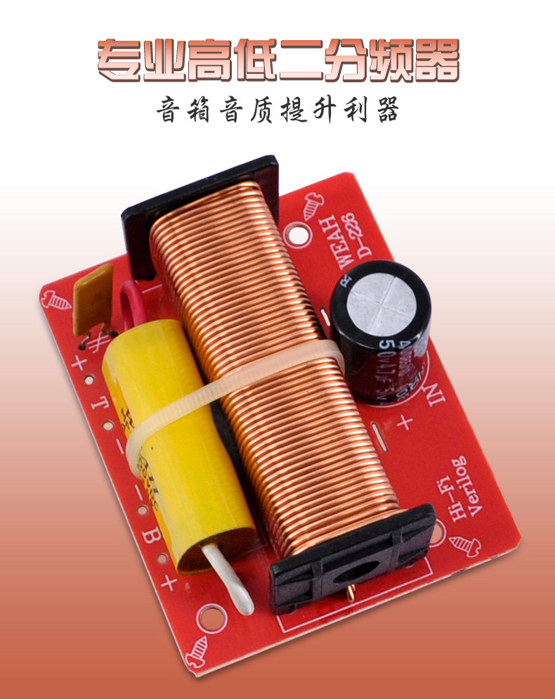 [ 该分频器适用一高音一低音的音箱,喇叭适用6欧、8欧、12欧等。]