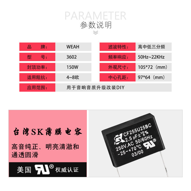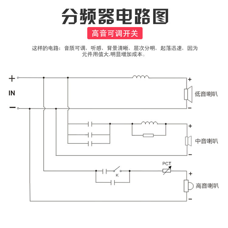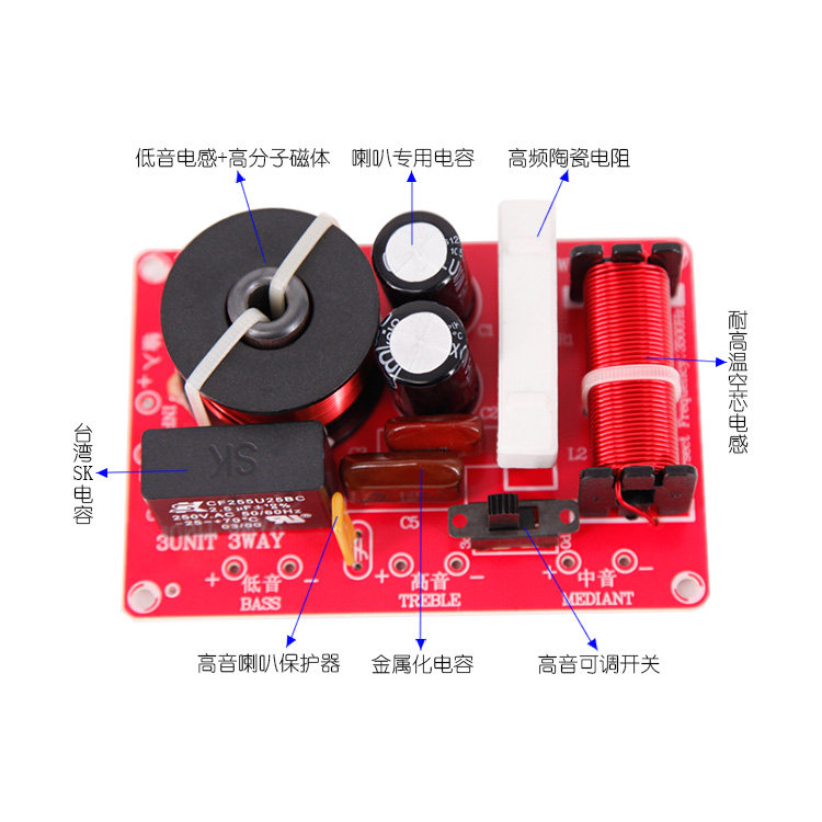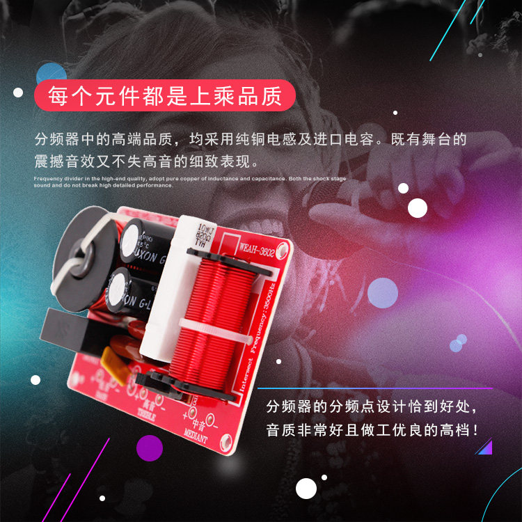 Частотный разветвитель достаточно, используя импортируемые конденсаторы, высокочастотное сопротивление фарфора, индуктивность провода высокой температуры и регулировка переключения, устройство защиты над тока, тонкое изготовление, разумное конструкция линии, обновление динамика и резкое оружие DIY.