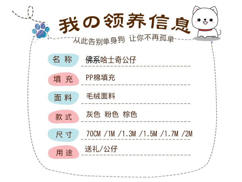 | Высота: | [Рекламная модель] 1,3 метра [Limited 200 продается для продажи], 80 см [любимая доставка подвесок], 1 метр [Соберите бесплатный кулон + куклу Хаски 30 см], 1,3 метра [Сводка и подарочные товары + 30 см Хаски кукла]], 1,5 метра [Сводка и подарочные предметы + 30 см Хаски кукла]], 1,7 метра [Сводка и подарочные товары + 30 см Хуски кукла], 2 метра [Соберите бесплатный кулон + куклу Хаски 50 см] |