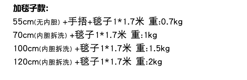 | Высота: | 55 см (без подкладки, молния съемная и можно стирать), 70 см (внутренний резервуар можно снять и постирать), 100 см (внутренний резервуар можно снять и постирать), 120 см (внутренний резервуар можно снять и постирать), Вкладыш, одеяло, 55см, Вкладыш, одеяло, 70см, Вкладыш, одеяло, 100см, Вкладыш, одеяло, 120см |