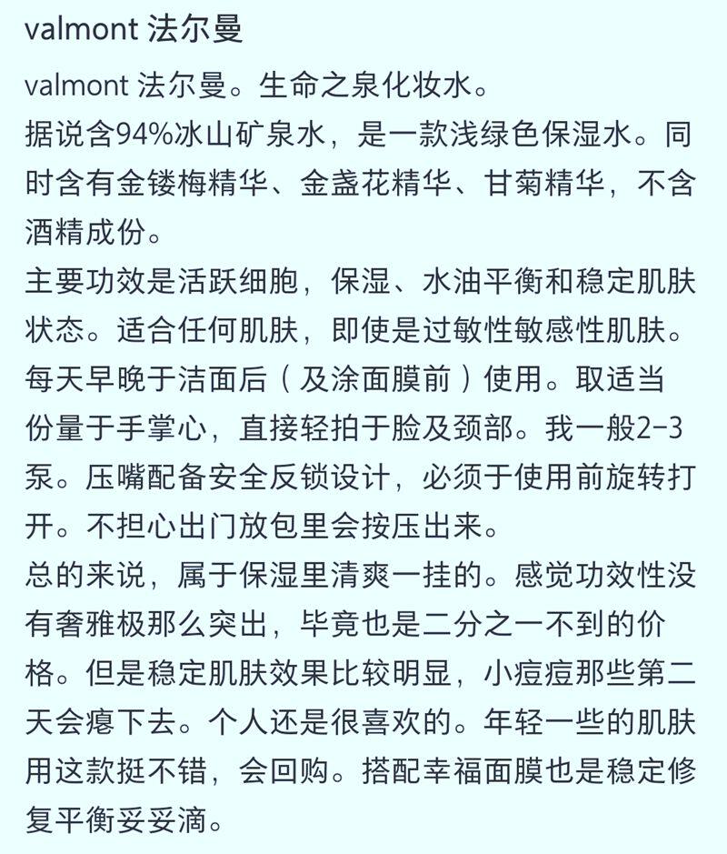 Серия очищающей кожи Valmont, не только очищает кожу: это также основная процедура для ухода за кожей.Содержит минеральную воду айсберга, которая помогает поддерживать различные важные функции кожи при очистке лица, включая: защиту, увлажнение, регенерацию кожи и т. Д. Это незаменимый вспомогательный продукт в ежедневных процедурах очищения кожи.Помогает продвигать систему микроциркуляции кожи, готовит кожу, поглощает другие продукты по уходу за кожей и оказывает его эффекты.После использования кожа чувствует себя освеженной и влажной, успокаивая и успокаивая клетки кожи.