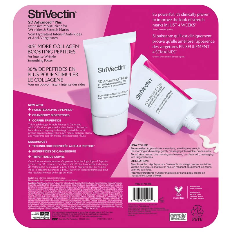 StriVectin SD Advanced PLUS Глубоко увлажняющий крем против морщин (2 x 47 мл) — это глубоко увлажняющий продукт для ухода за кожей, специально предназначенный для борьбы с мимическими морщинами и растяжками. Он помогает восстановить текстуру кожи, уменьшить видимость тонких линий, морщин и растяжек, а также вернуть коже гладкое и упругое состояние.Ниже приводится китайское описание продукта: