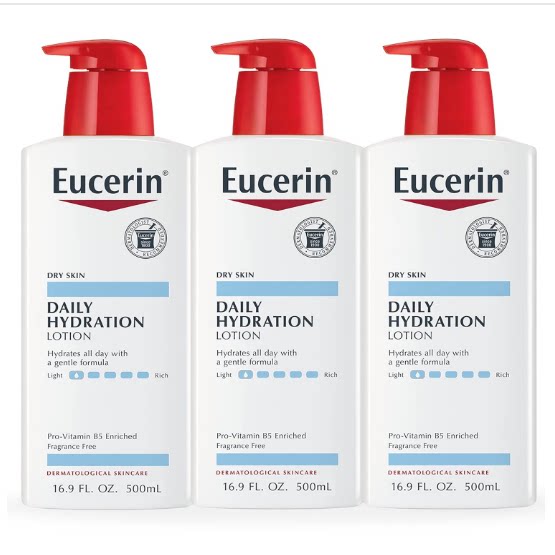 - В комплект входят три (3) флакона с помпой емкостью 16,9 унций лосьона для тела Eucerin Daily Hydration.