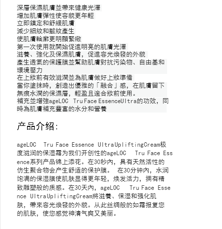 ageLOC Tru Face Essence Ultra Uplifting Cream Ультраувлажняющий крем, дополняющий нашу революционную линейку ageLOC Tru Face Essence.За 30 секунд природный активный биомиметический полимер создает комфортную защитную пленку.Через 30 минут увлажняющая маска придает коже более молодой, обновленный вид и нежную скульптурную текстуру.За 30 дней ageLOC Tru Face Essence Ultra Uplifting Cream питает, увлажняет и укрепляет кожу, придавая ей сияющий вид.С этого момента шелковистый иней покроет вашу кожу, оставляя ощущение свежести и красоты.