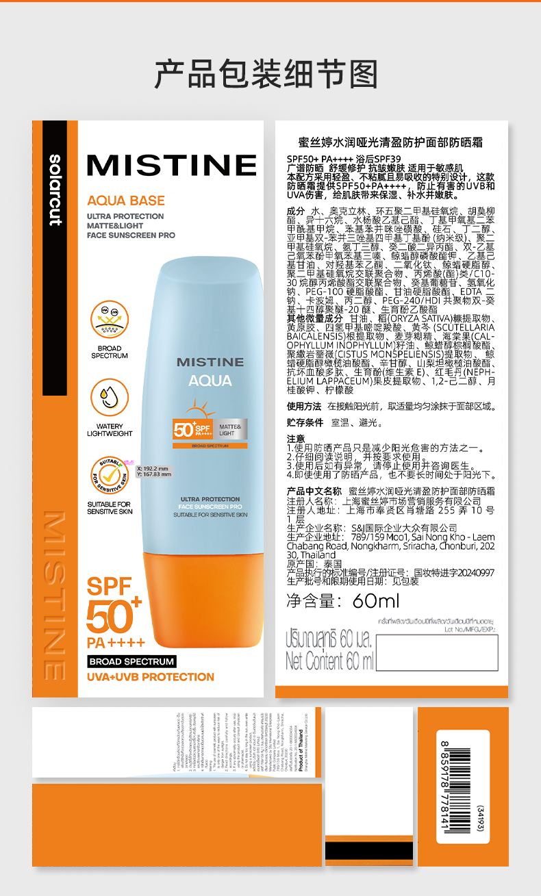 Mistine Солнцезащитный крем для лица для всего тела, 40 мл, УФ-защита, SPF50