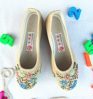 БЕСПЛАТНАЯ ДОСТАВКА: Линейная ткань вставки Старый Пекин холст средние склоны и ленты носят маленькие цветочные одиночные туфли бежевые
