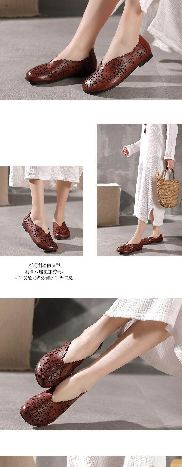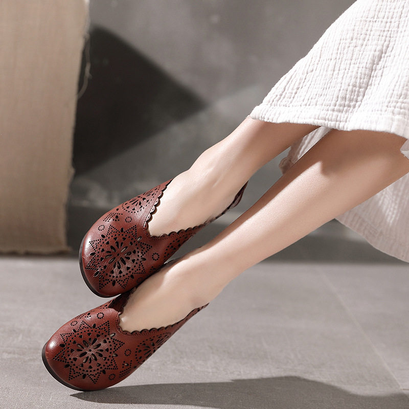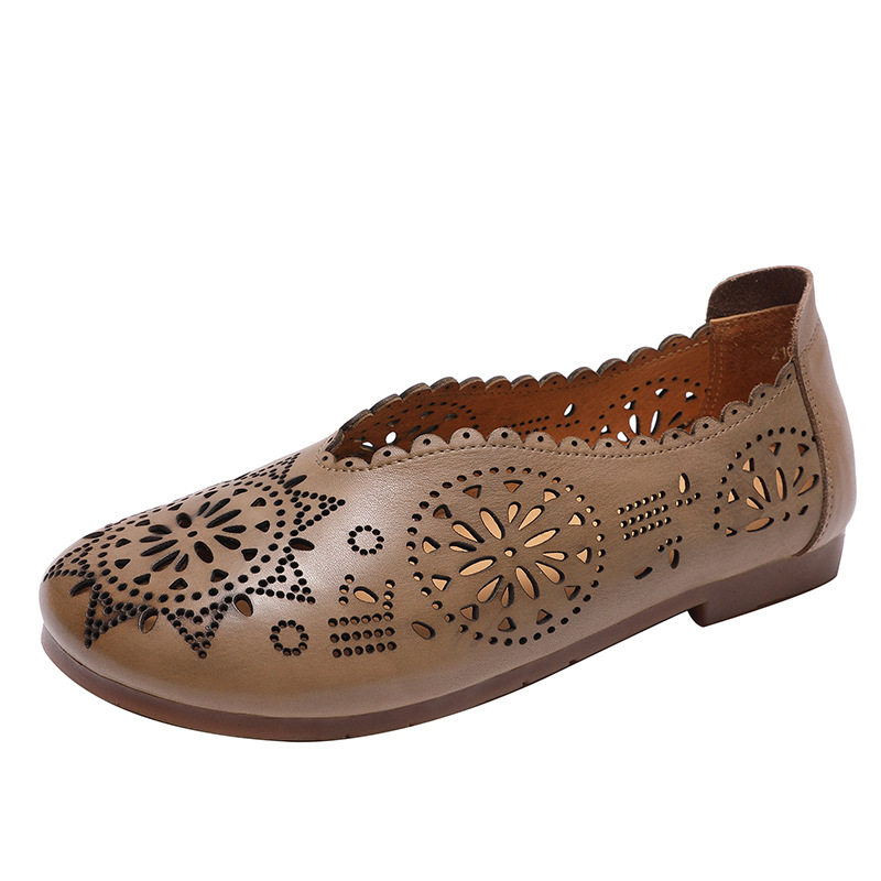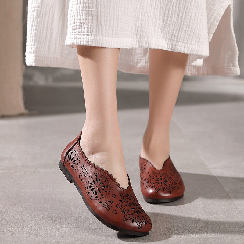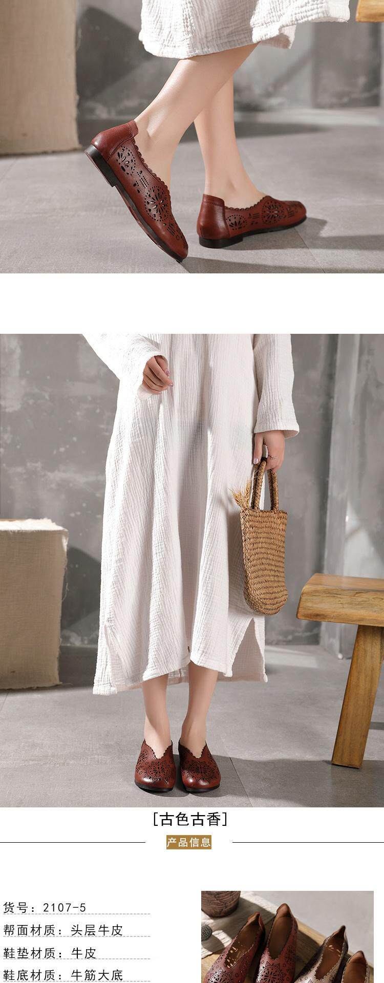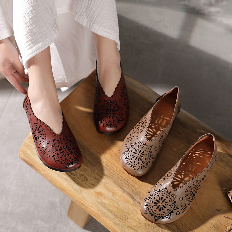 2021 Весна и летняя ретро -ручные дамы одиночные туфли кожаная легкая рот женская обувь плоская каблука мягкие дно кожаные полые отверстия Tide Tide