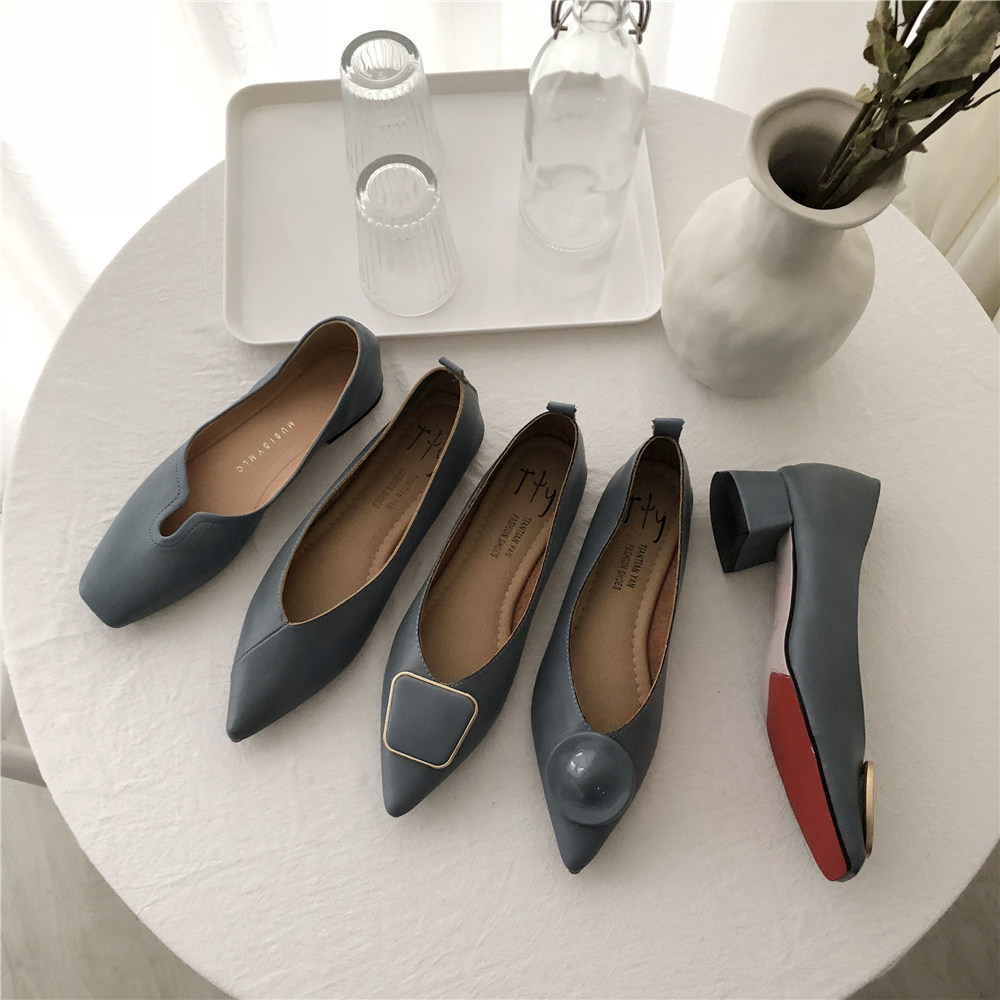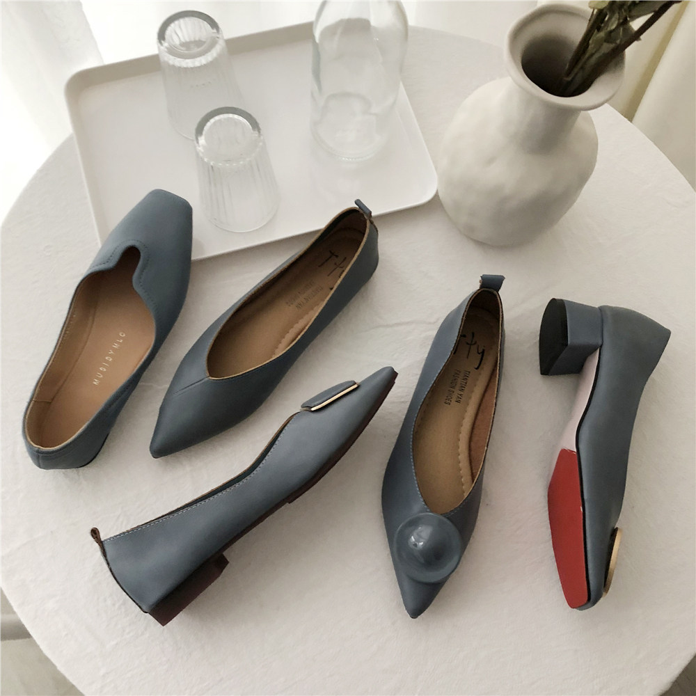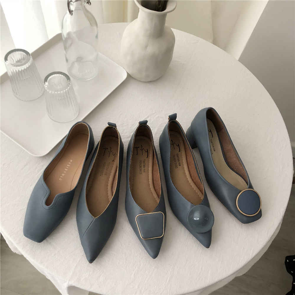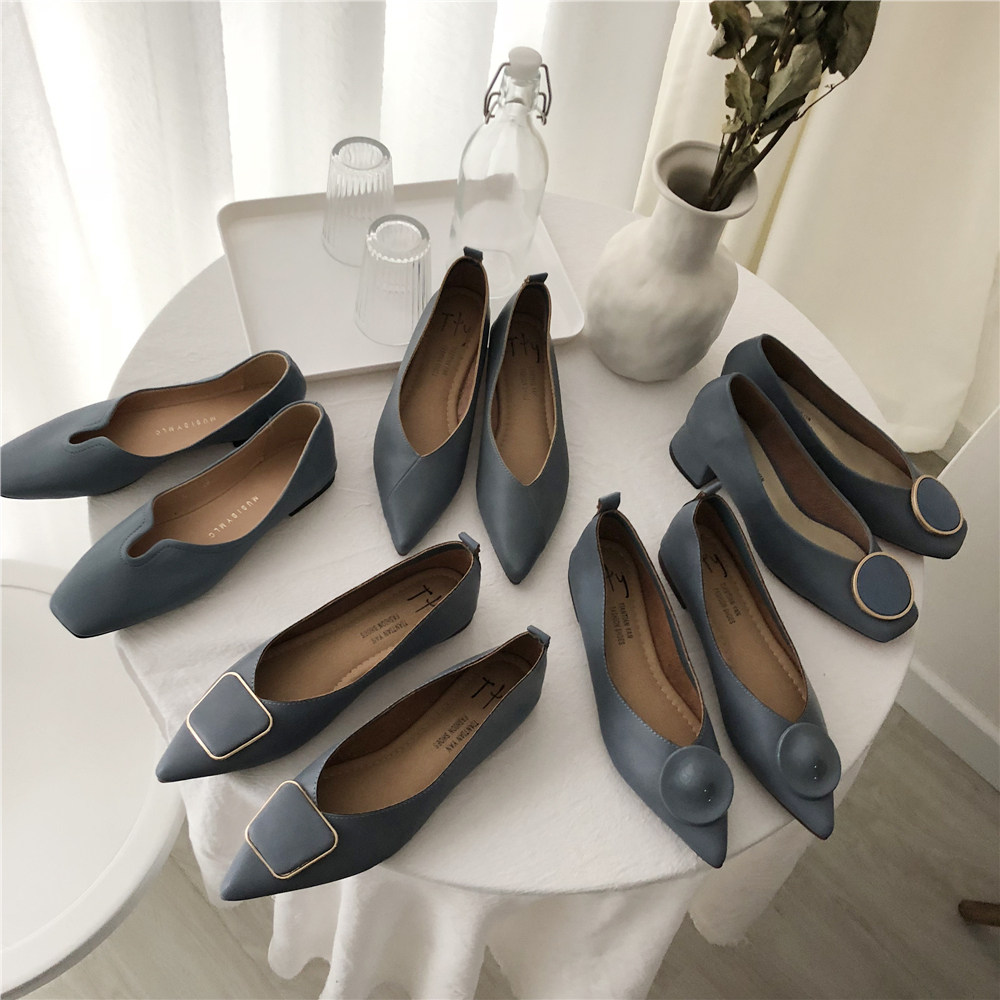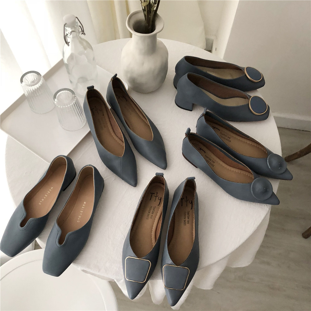 2019 Осень и Зимние женские туфли одиночные обувь ~ серия серии Morandi Haze Blue Pointed Head Flat Low Low -The Heald Syste -Thos