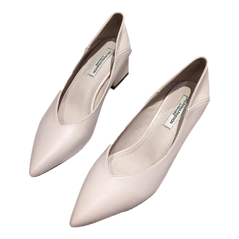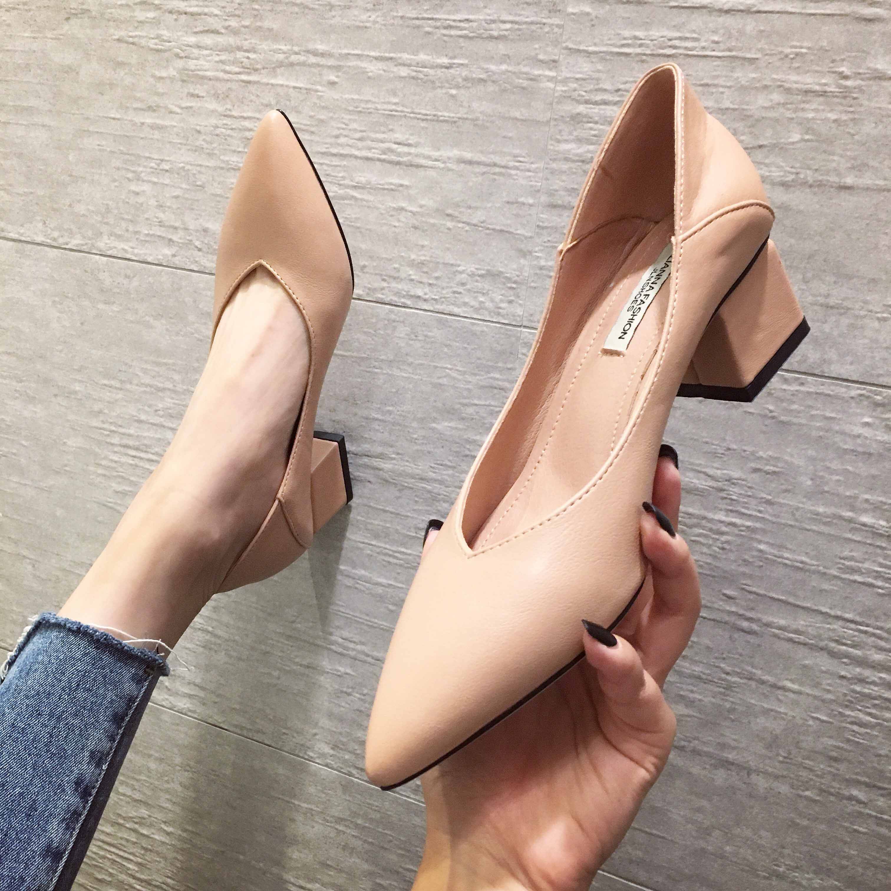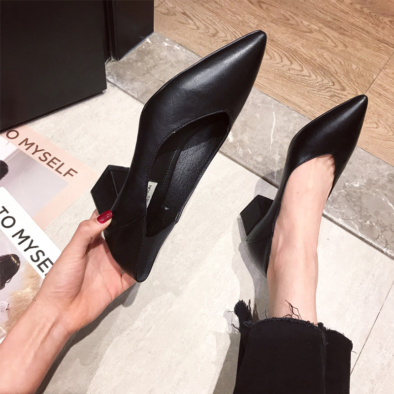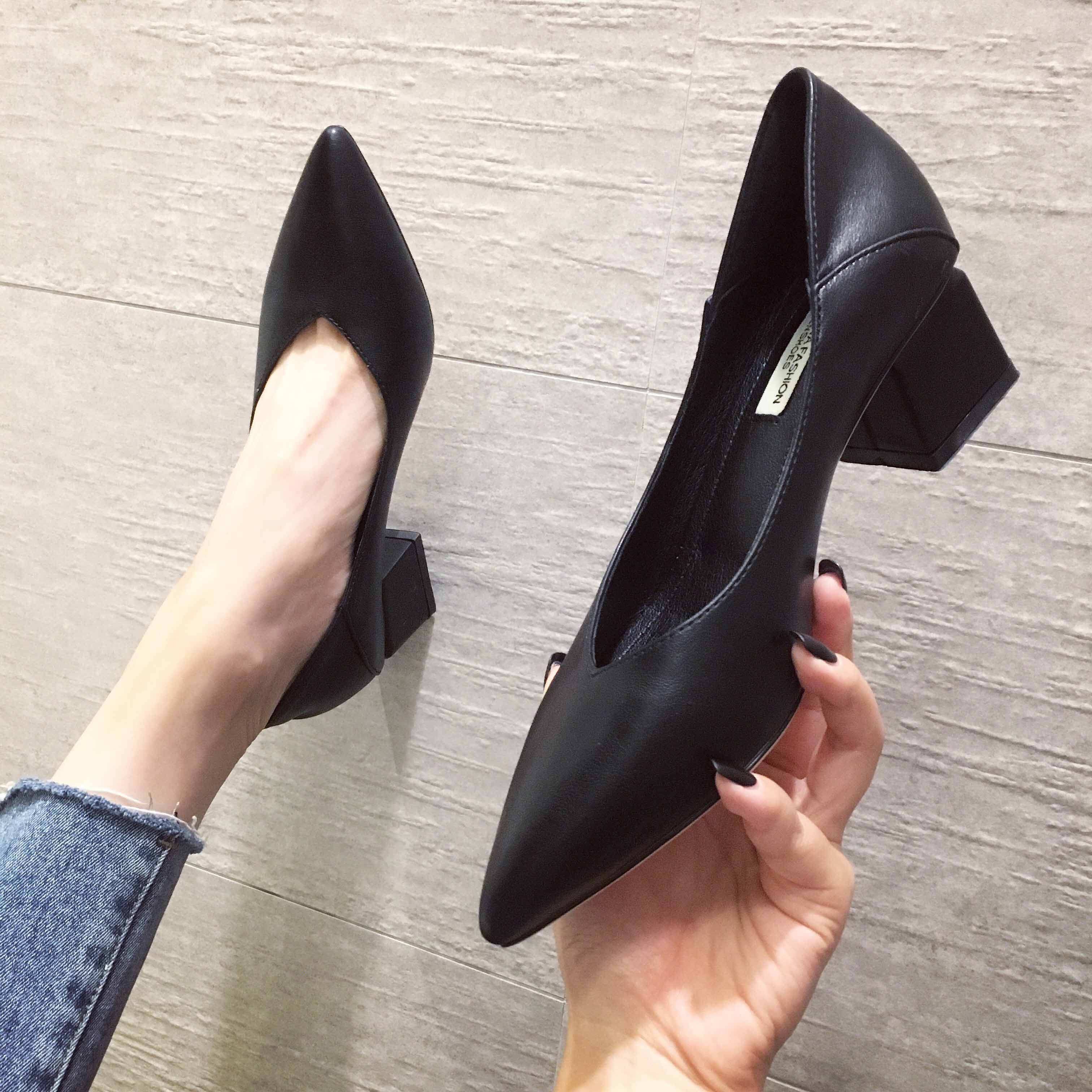 Весенняя черная рабочая обувь на высоком каблуке с заостренным носом