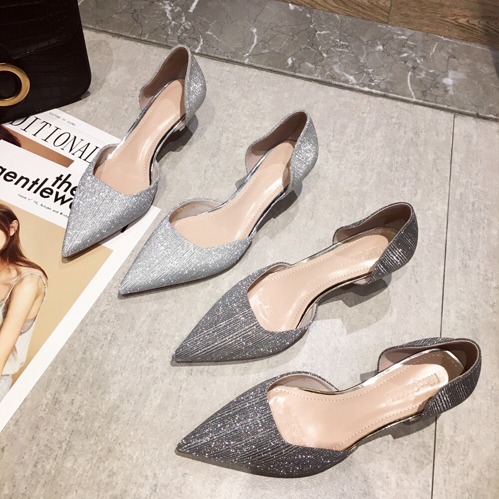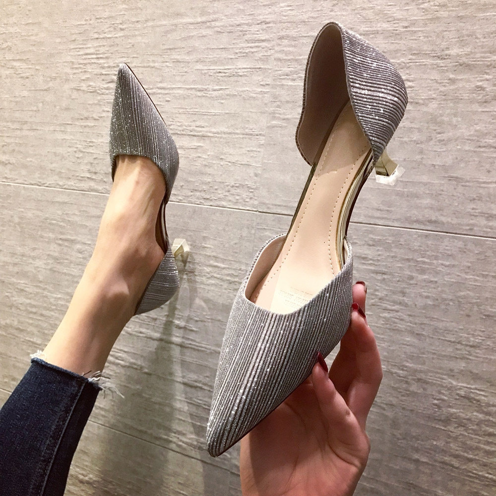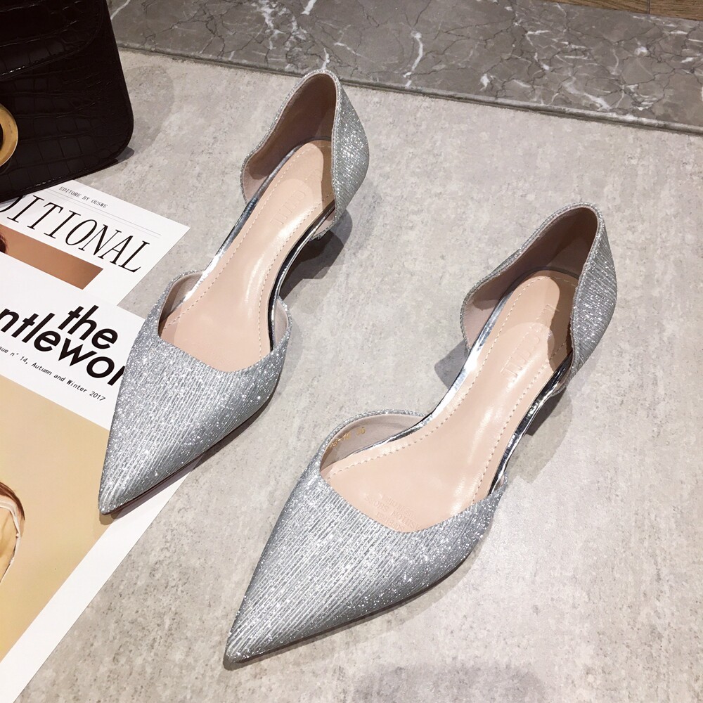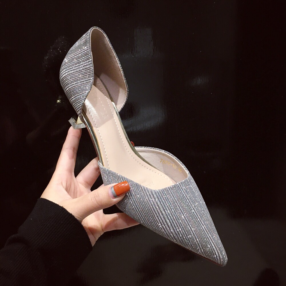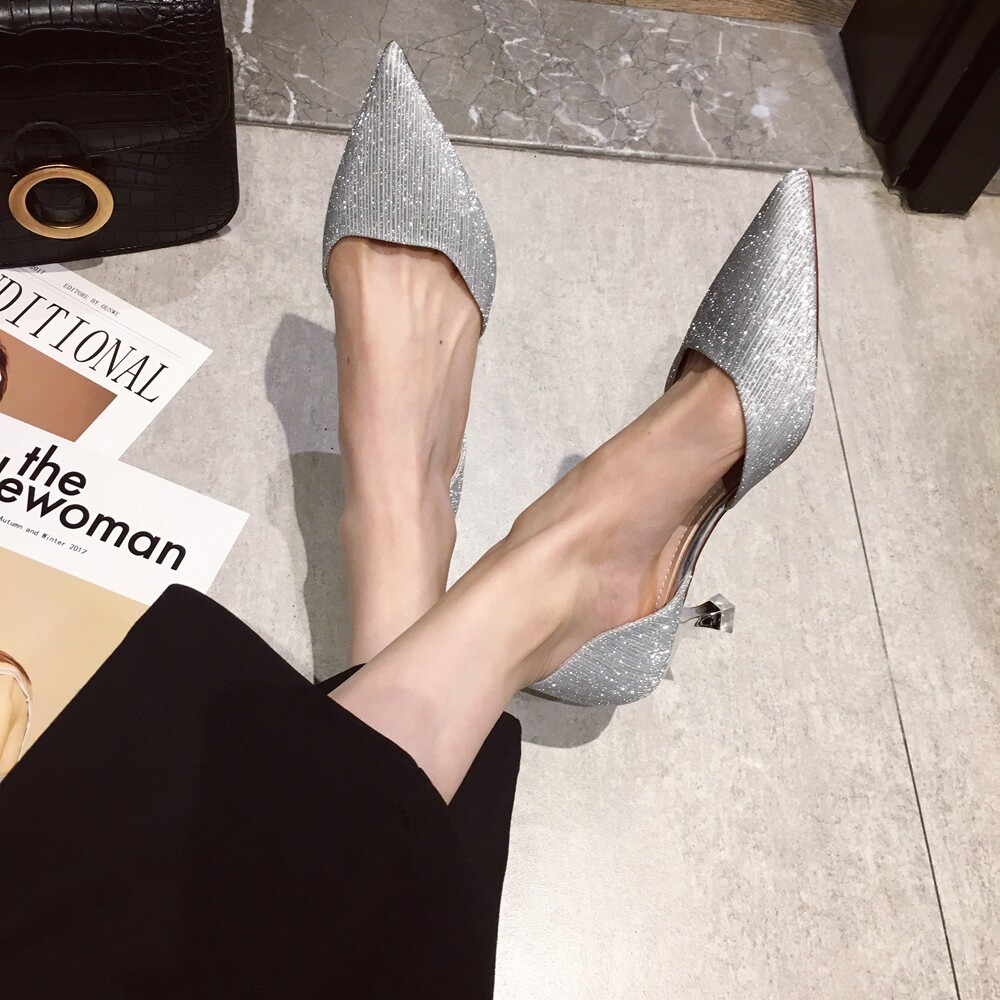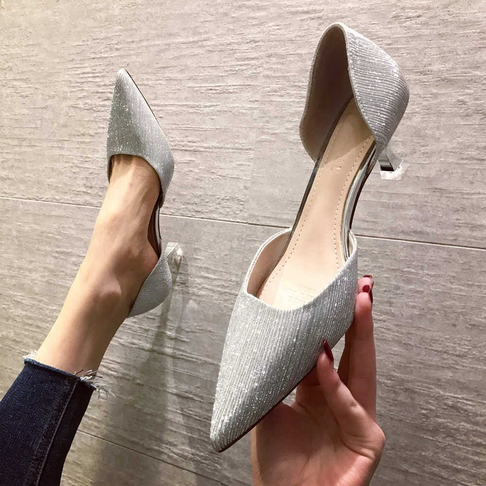 Свадебные туфли для невесты, весенние универсальные серебряные блестки для ногтей, обувь на высоком каблуке с заостренным носом, коллекция 2021, тренд сезона, для подружки невесты