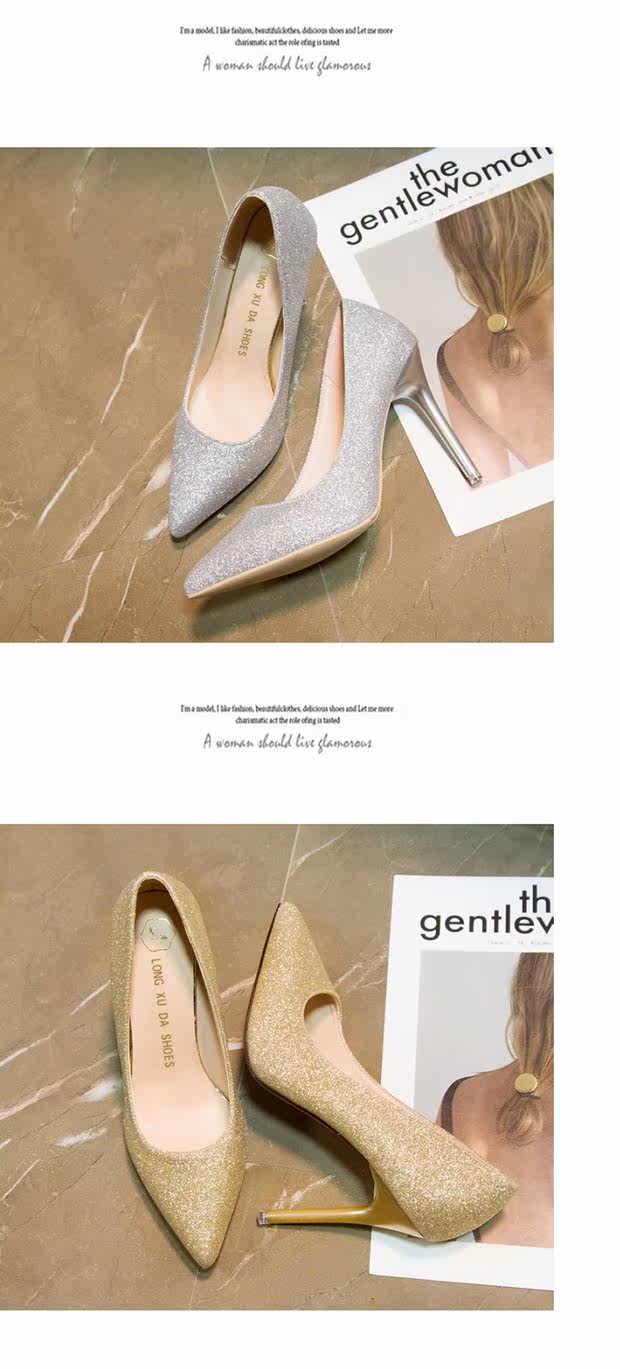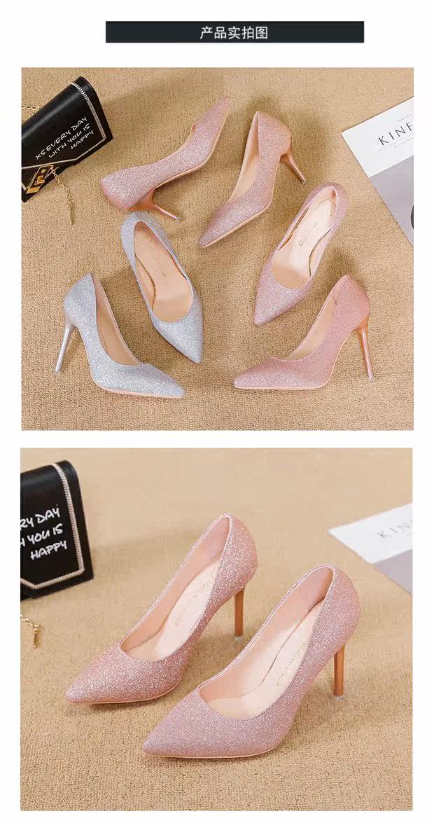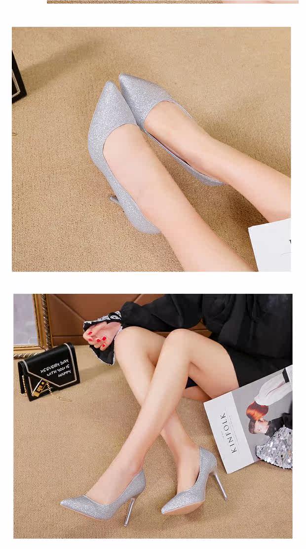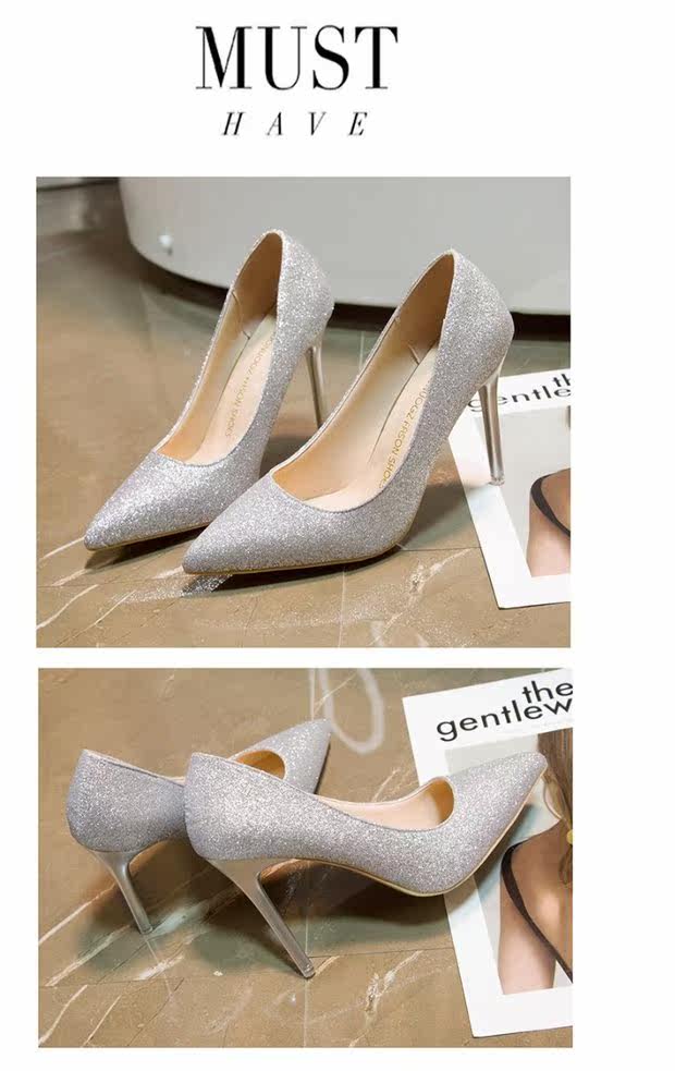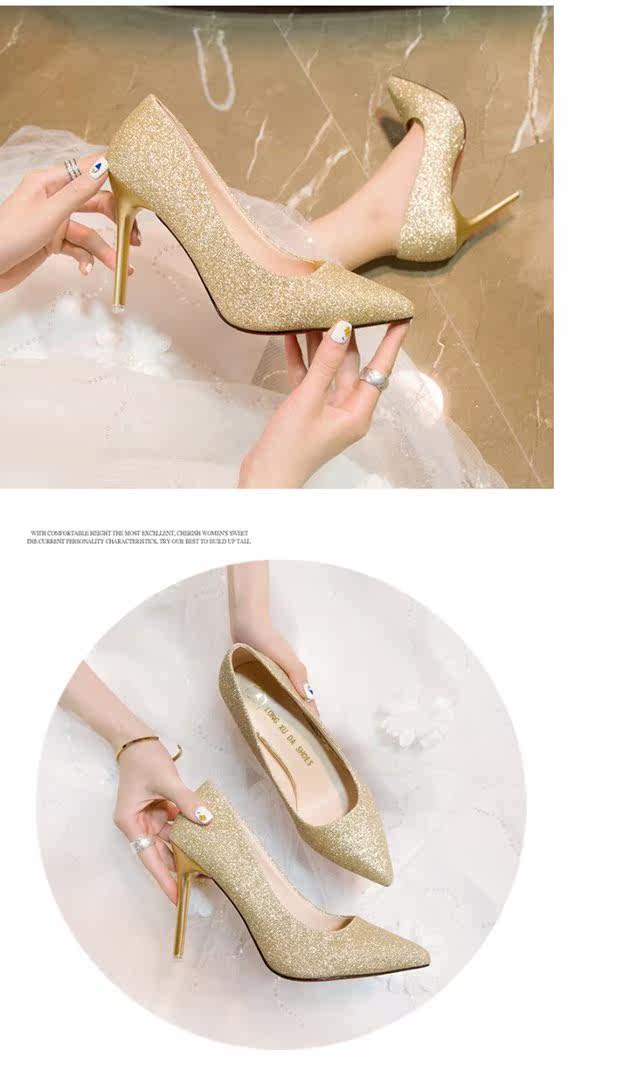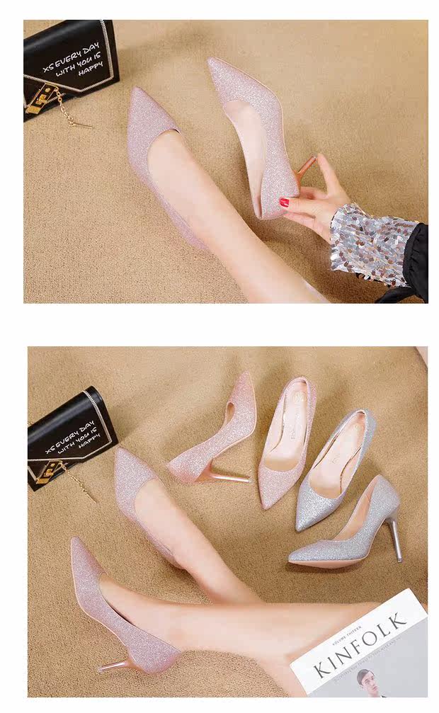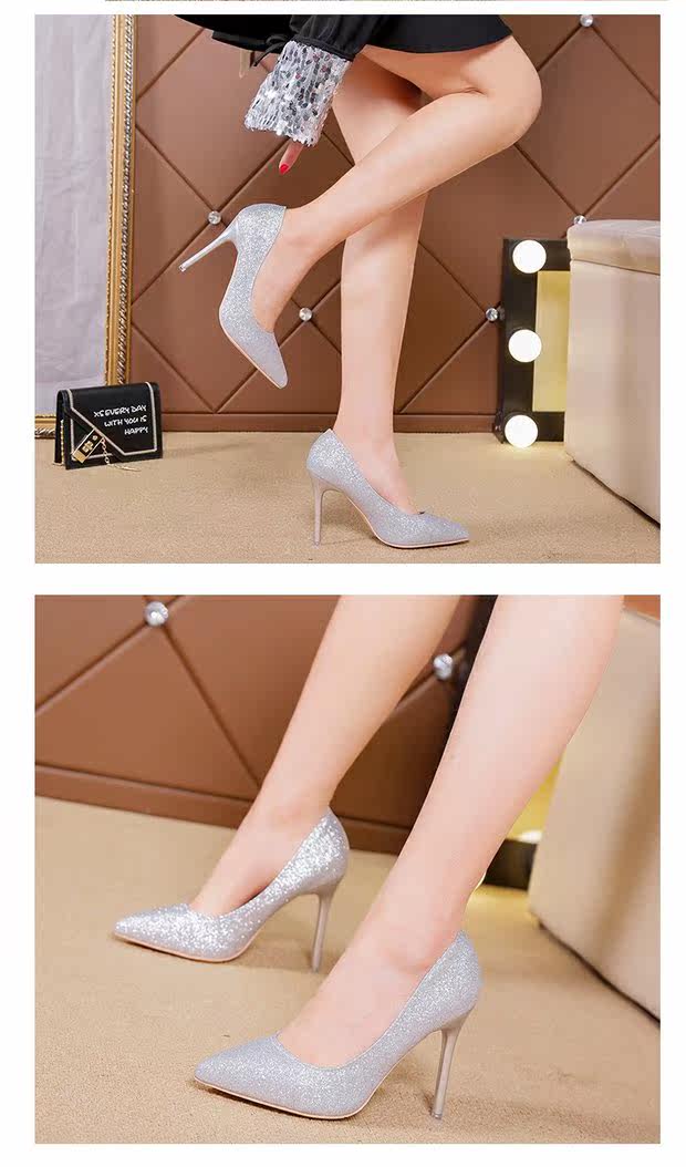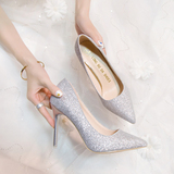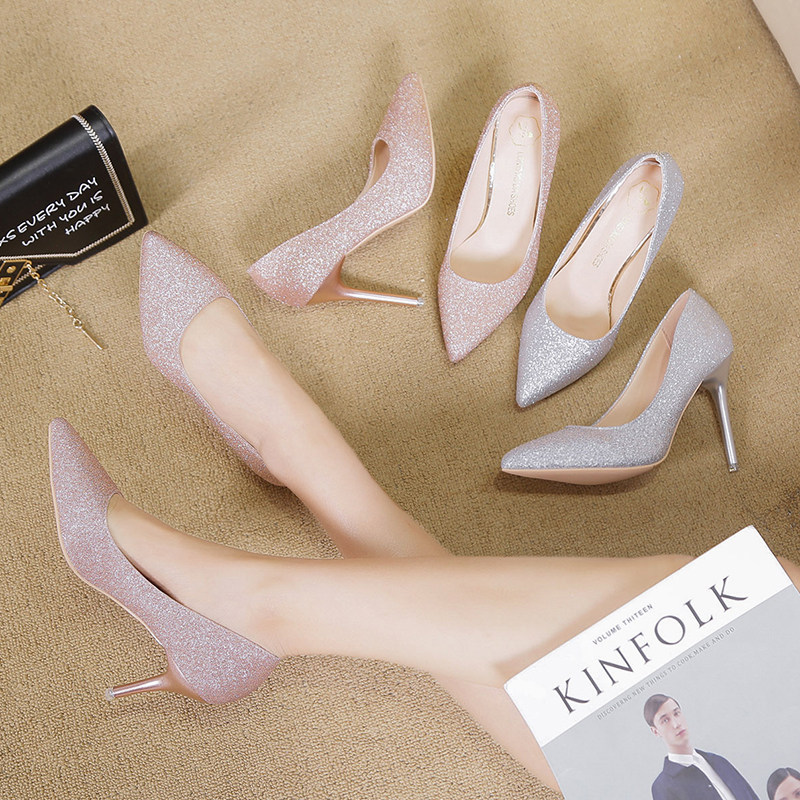 Свадебные туфли, демисезонная обувь, серебряные блестки для ногтей с заостренным носом на высоком каблуке, 2020, французский стиль
