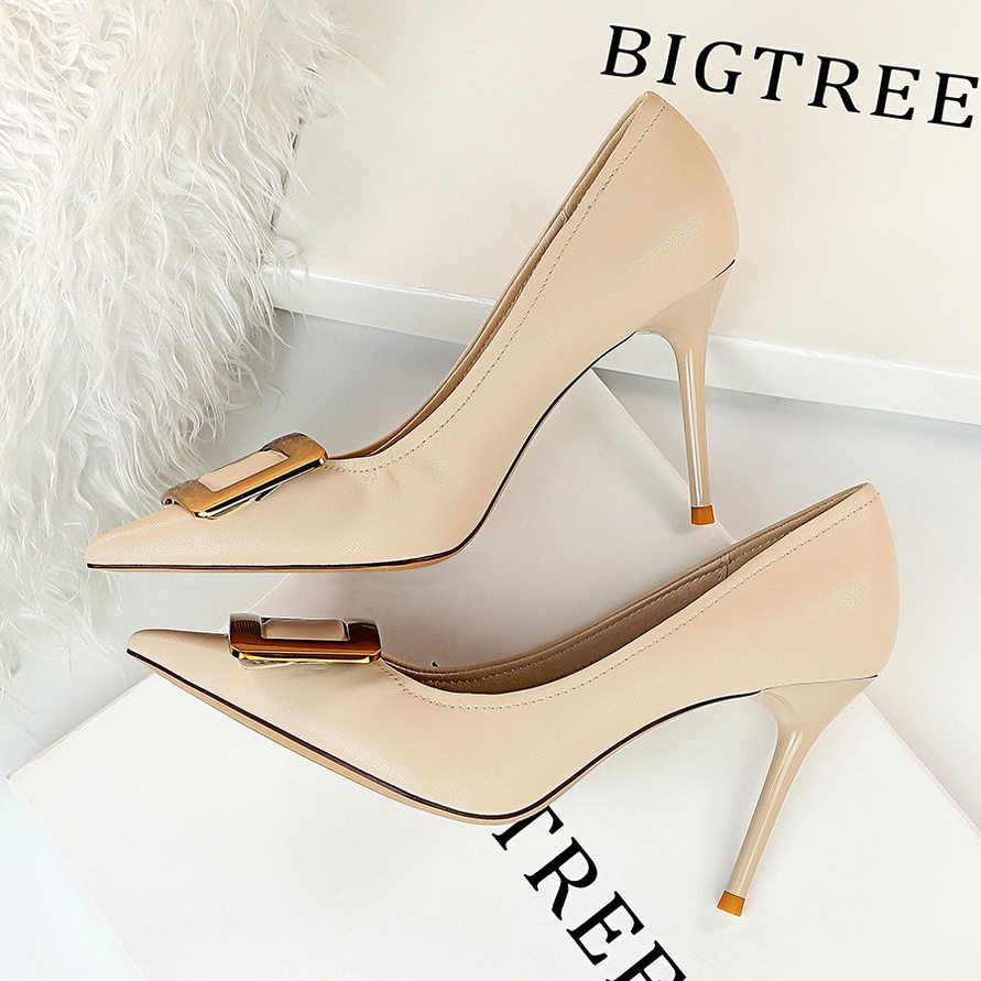 Сексуальные и удобные туфли ПР, темпераментные, новый летний стиль, острый нос, шпилька, квадратная пряжка, высокие каблуки абрикосово-желтого цвета, 9 см, универсальные.