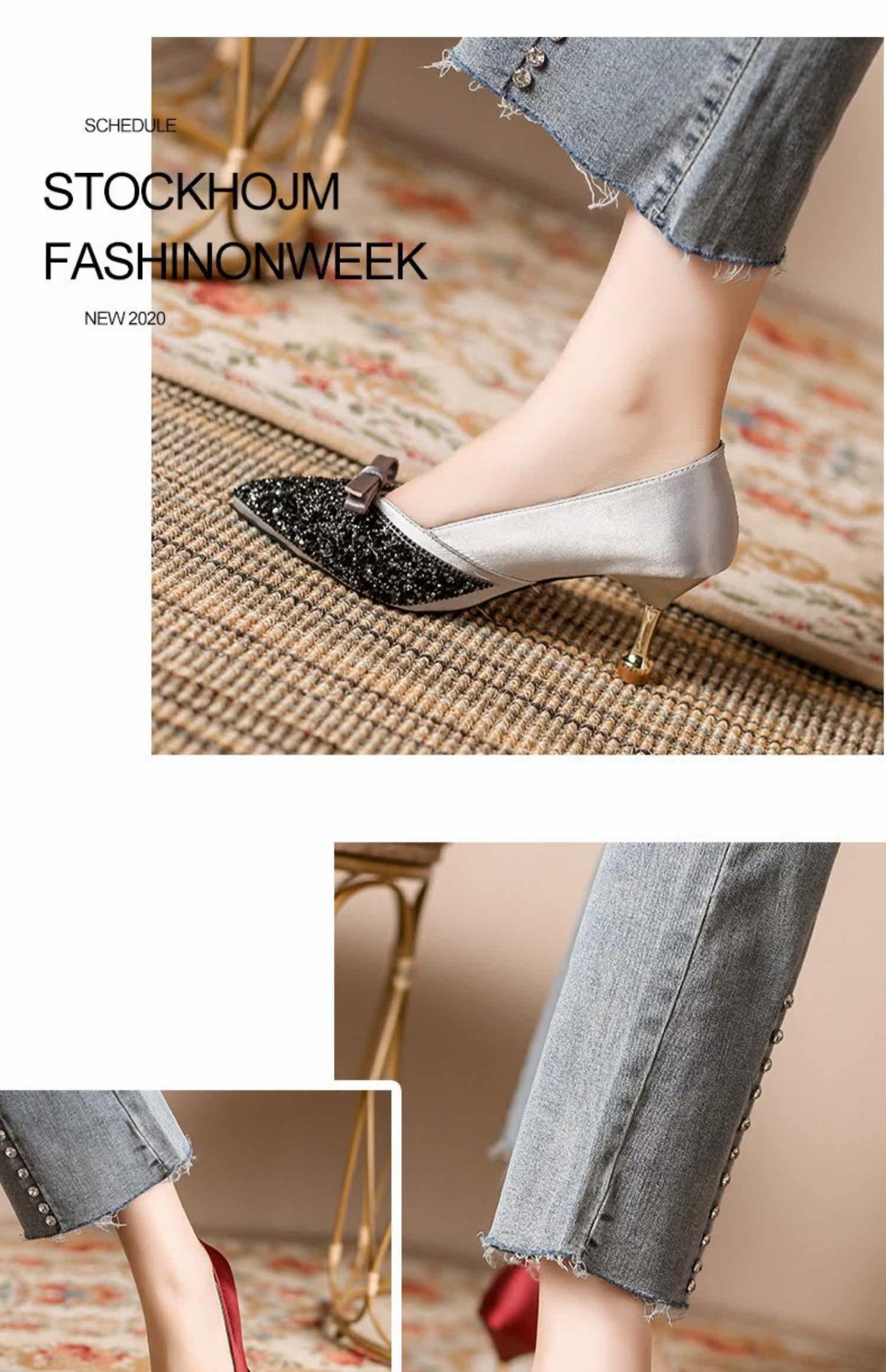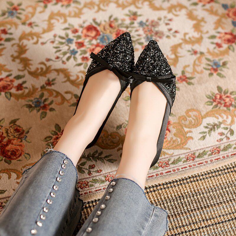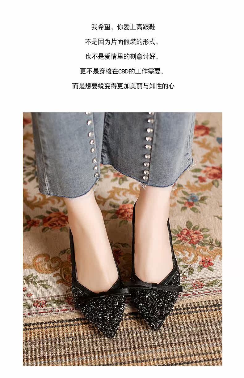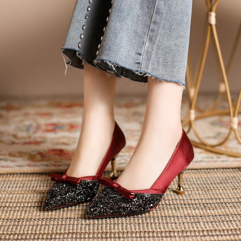 Модные женские весенние 2021 года с острым носком и бантом, новый стиль, универсальные французские туфли на шпильке с неглубоким горлышком, темпераментные атласные французские туфли со стразами