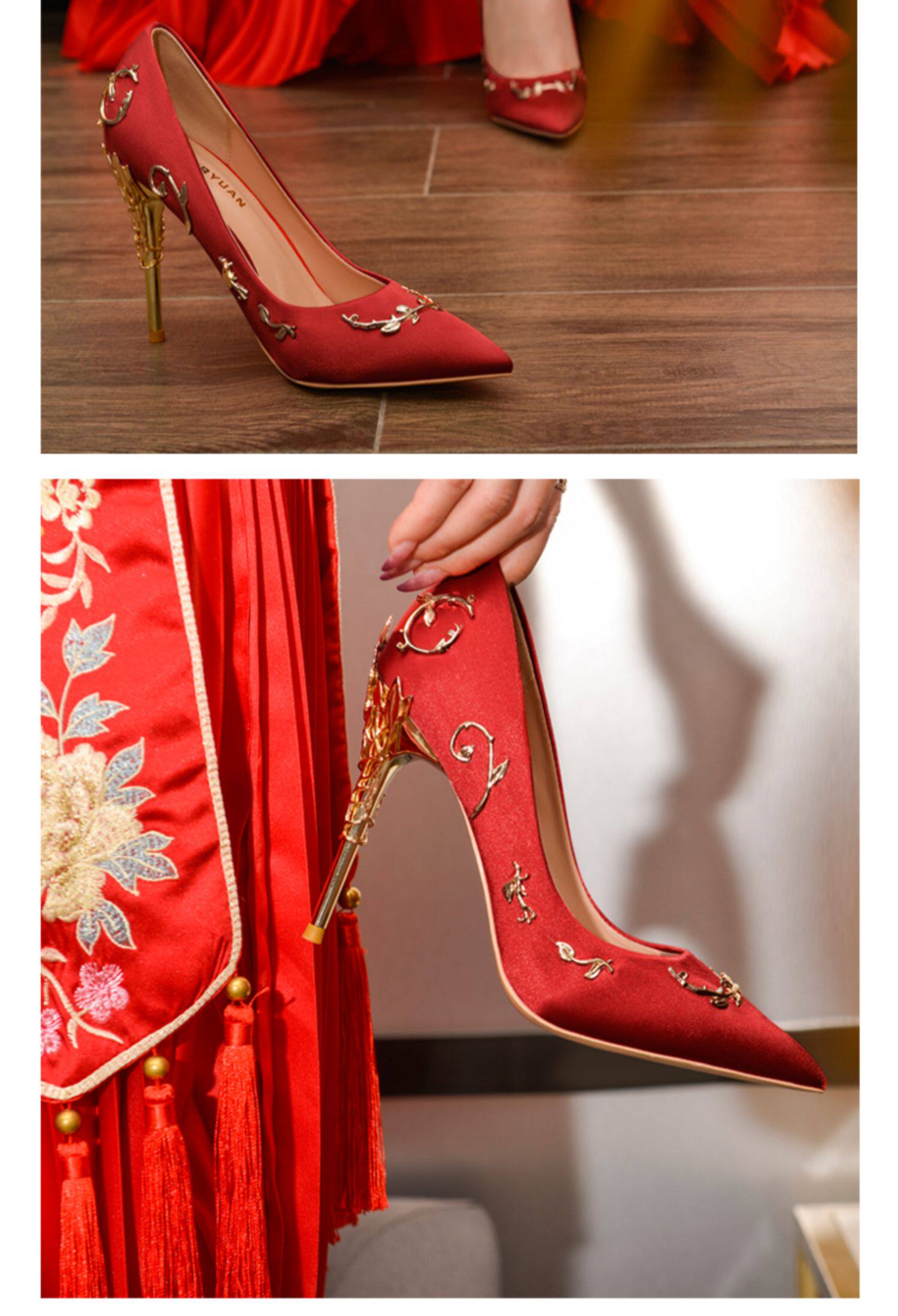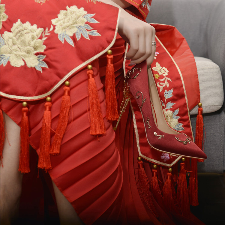 Красный традиционный свадебный наряд Сюхэ, свадебные туфли, туфли на высоком каблуке, свадебное платье для невесты, дракон и феникс