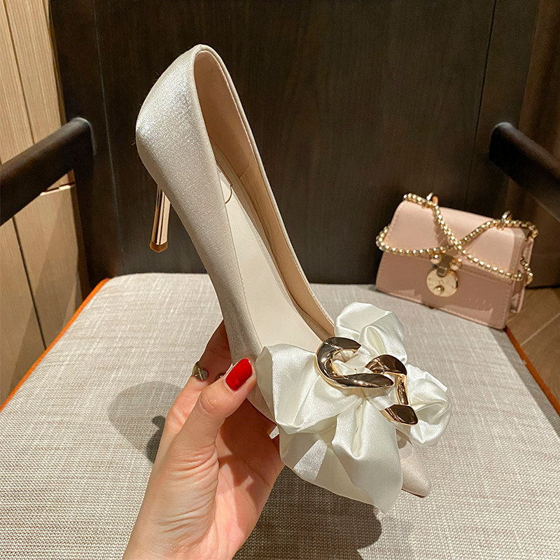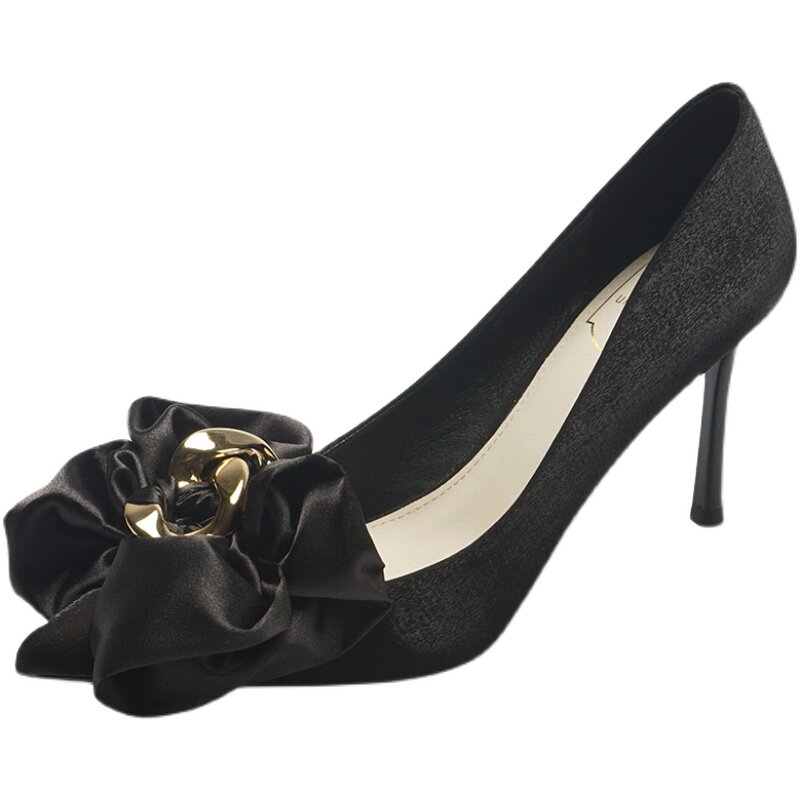 Весенние сексуальные туфли на высоком каблуке с заостренным носом с бантиком с низким вырезом, большой размер