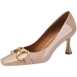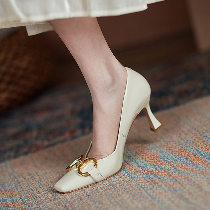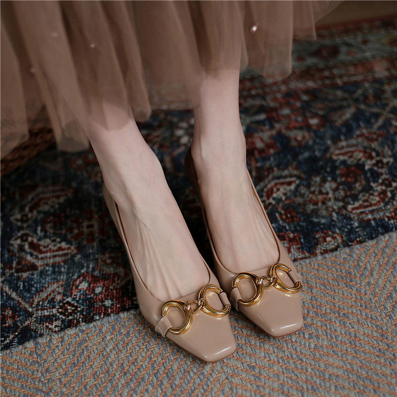 Полная кожа внутри и снаружи ~ мягкая!Патентная кожа высокие каблуки женская металлическая пряжка кубики одиночные туфли неглубокая рот тонкая каблука Элегантная яркая кожа