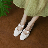 Туфли из натуральной кожи из французской натуральной кожи с жемчужным бантом и квадратным носком на мелком каблуке, среднем каблуке и толстом каблуке, нежные стильные бабушкины одиночные туфли, летние туфли на двойном каблуке