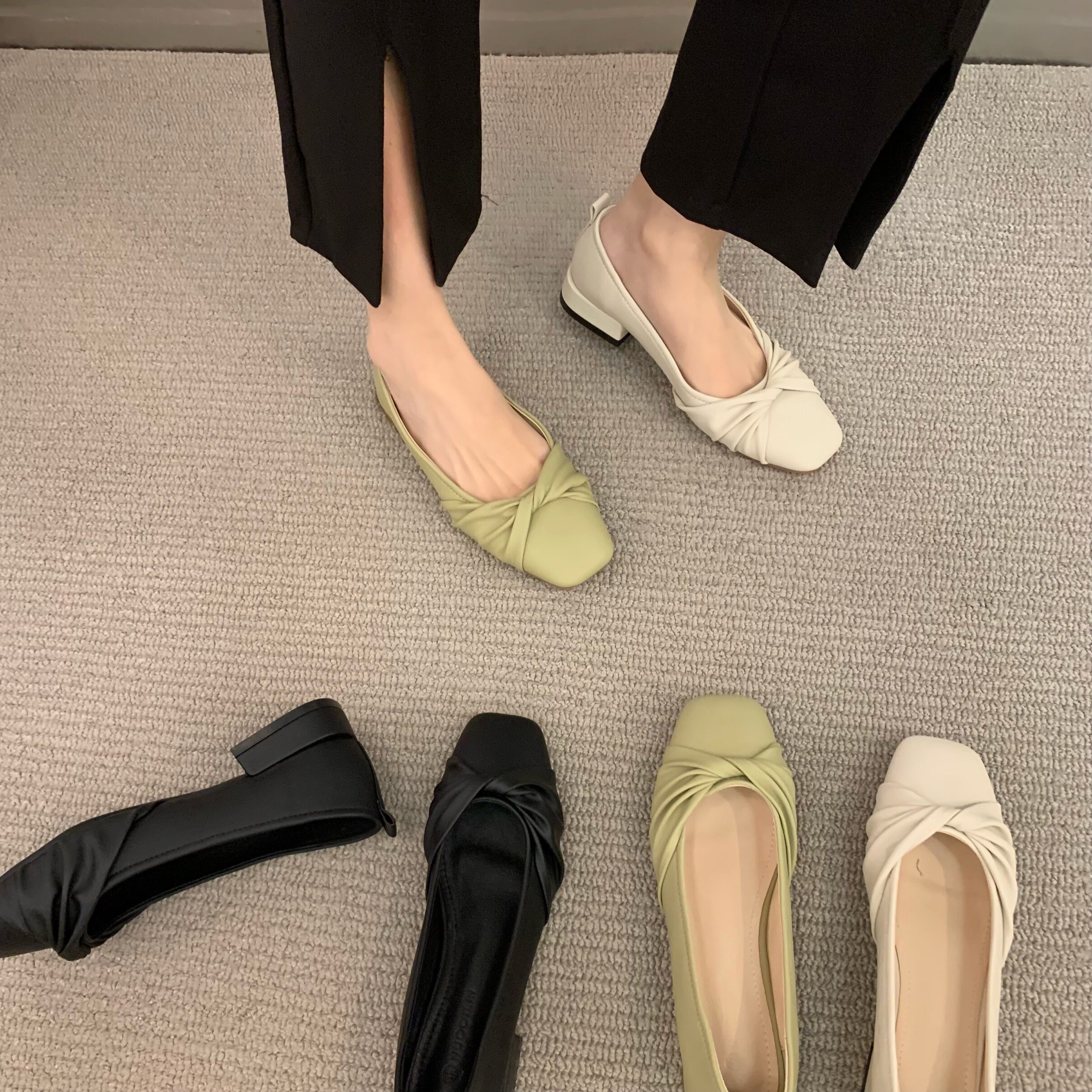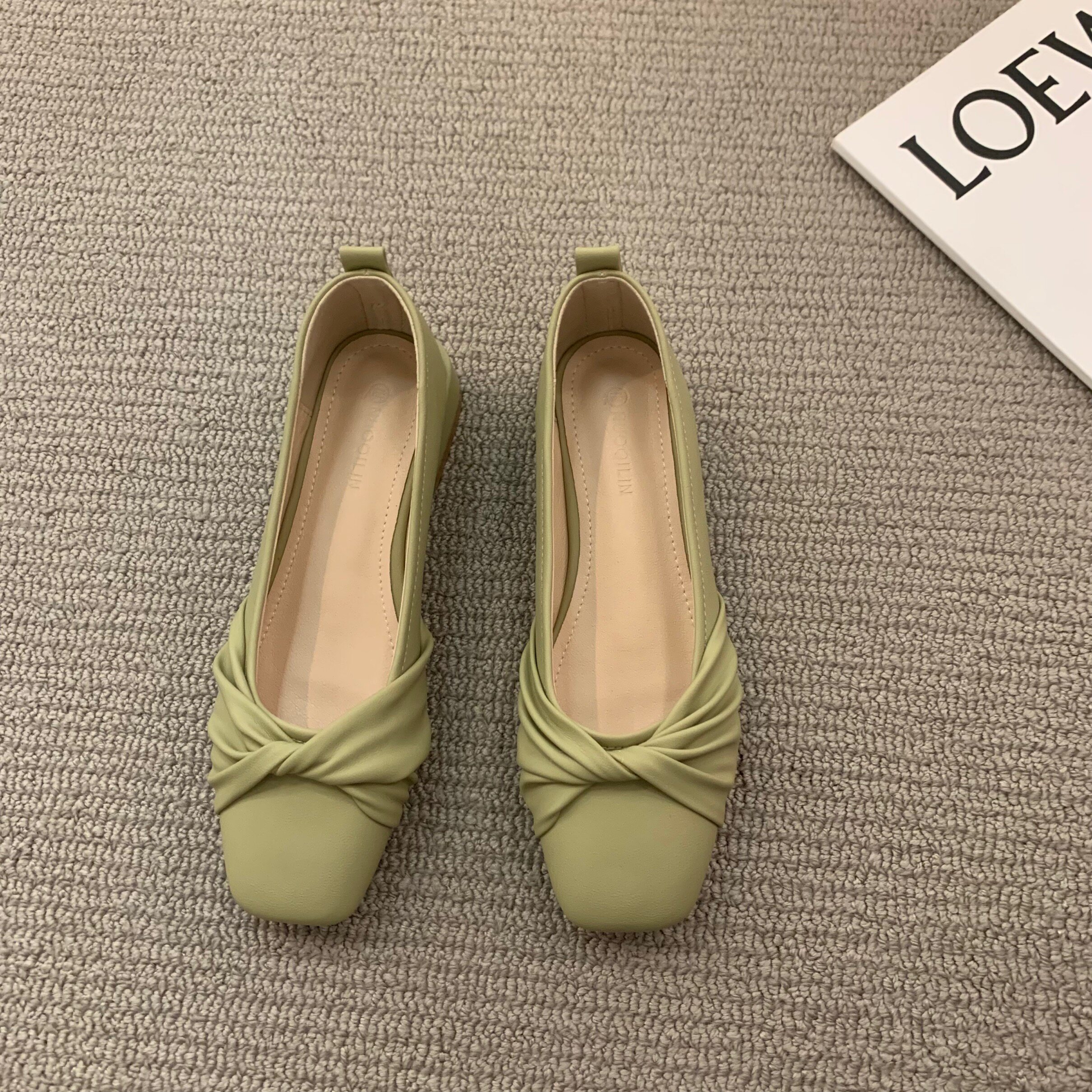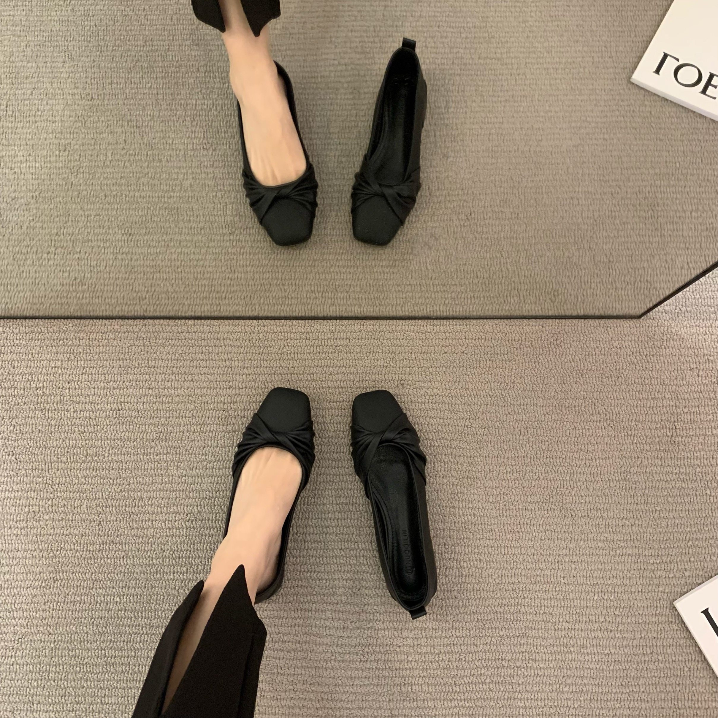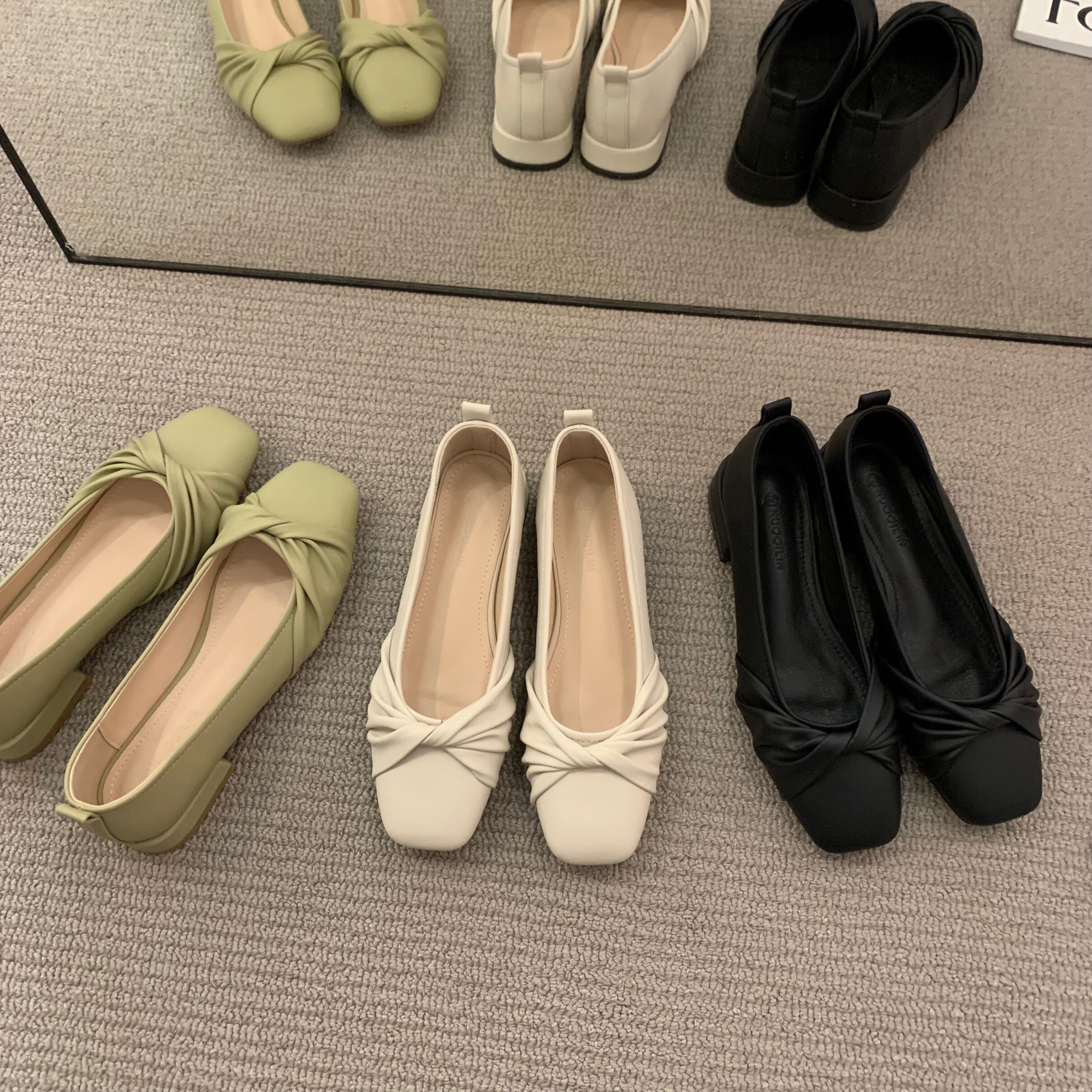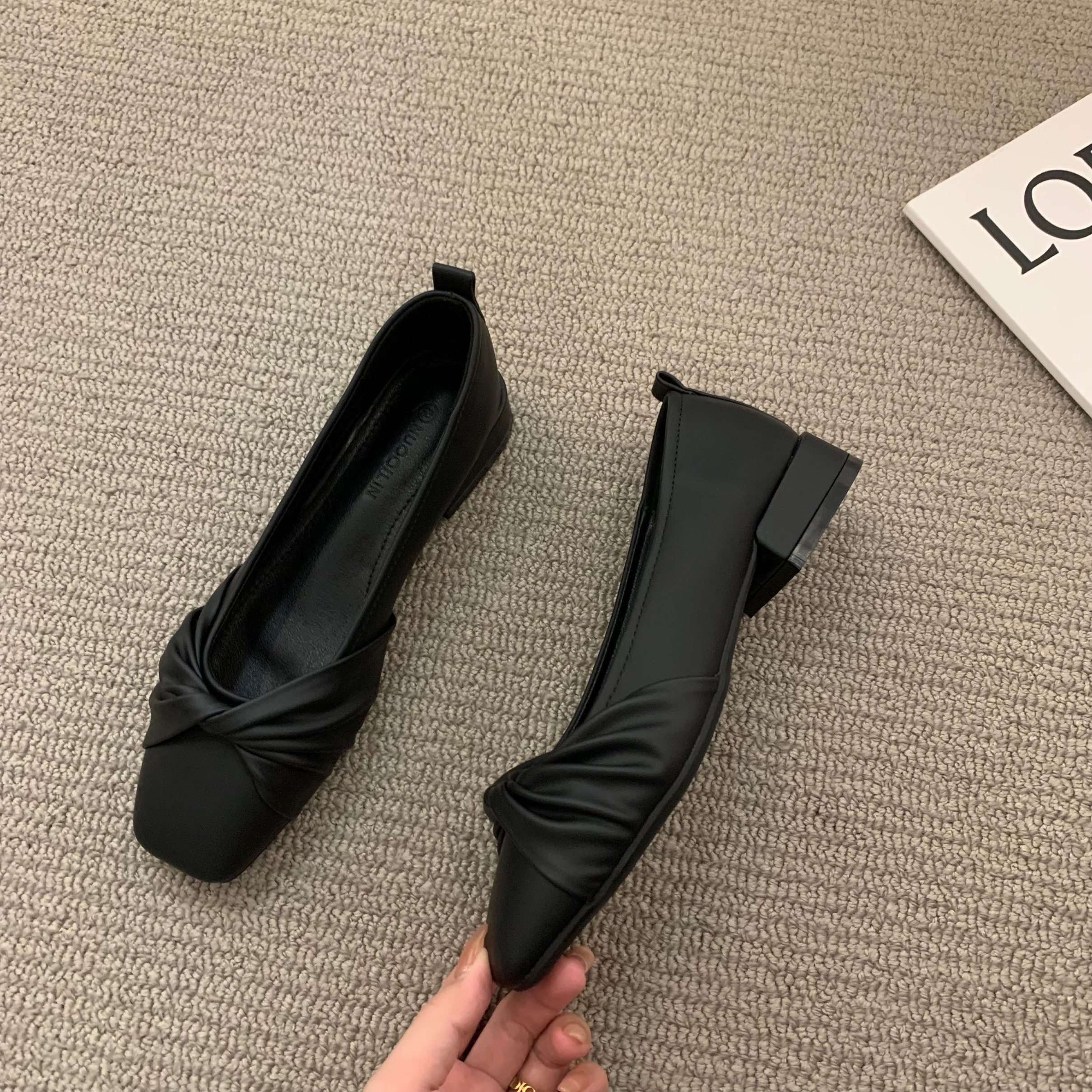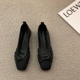 Низколепа квадратные черные туфли для одиночной обувь женская женская обувь 2023 Новая весенняя плоская складка ретро -скрещивание и осенние совок обуви