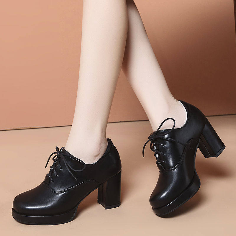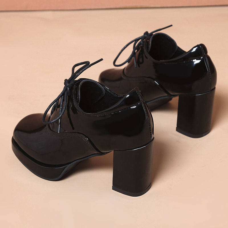 Весна и осенние высокие каблуки Женские густые каблуки патентной кожи глубокой туфли для одиноких туфлей Женская кожаная обувь Водонепроницаемы