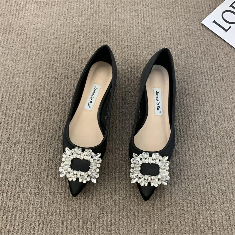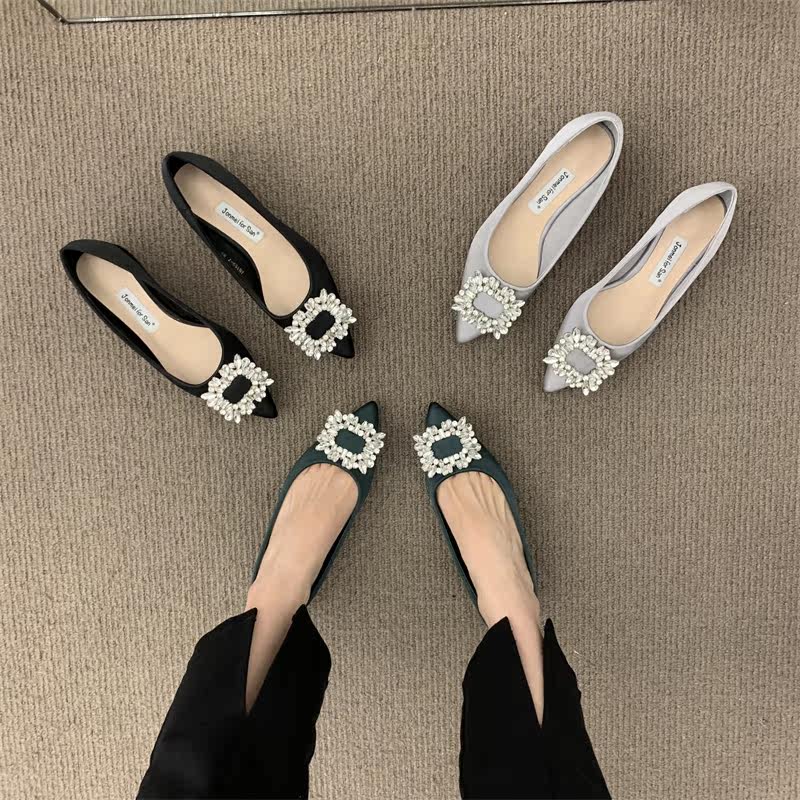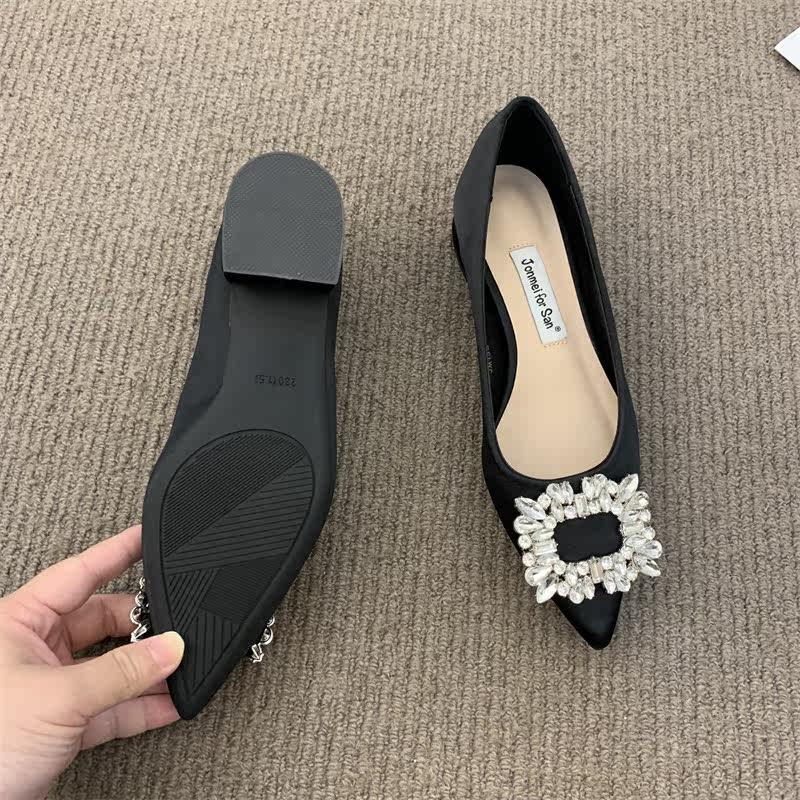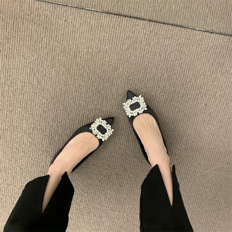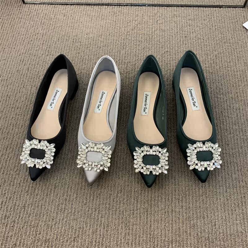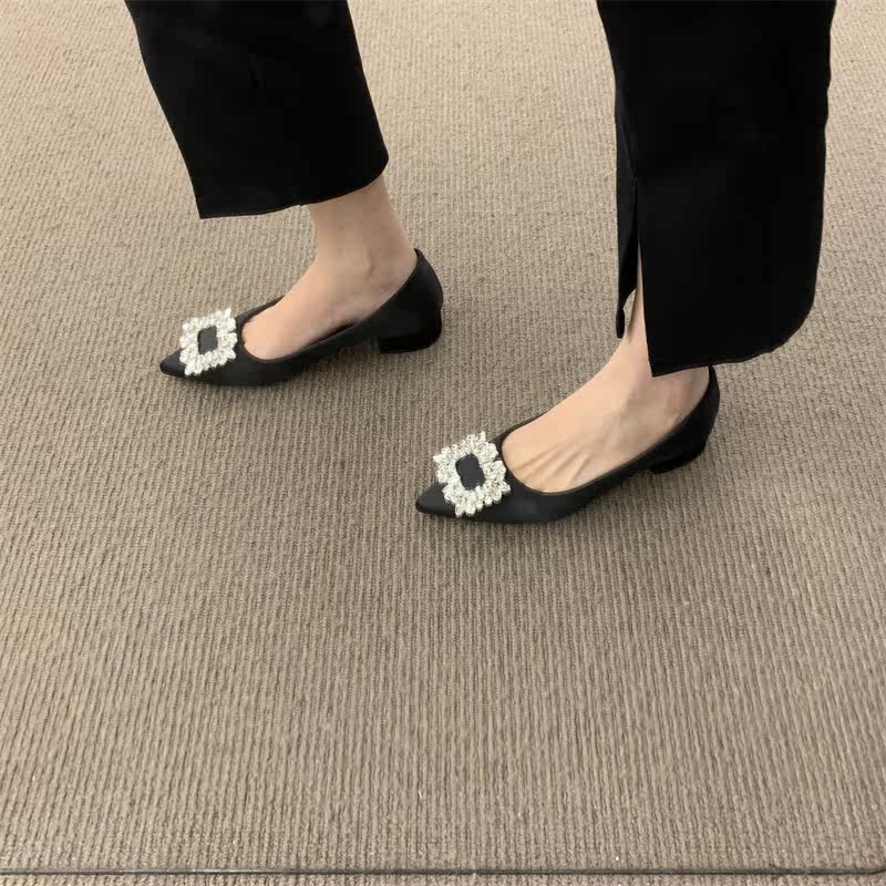 Женские туфли на низком каблуке 2022 года, весна и осень, новые интернет-знаменитости в том же стиле, удобные рабочие туфли с острым носком, стразами и квадратной пряжкой для мелководья
