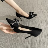 Черная дизайнерская обувь на высоком каблуке с заостренным носом с бантиком, французский стиль, коллекция 2022, тренд сезона