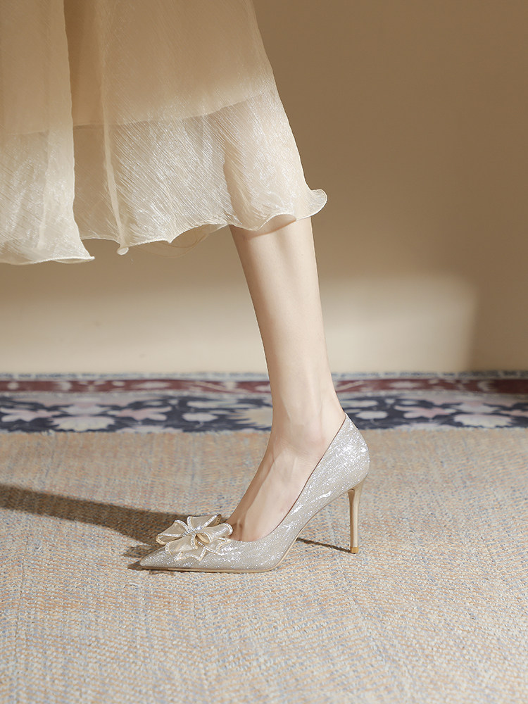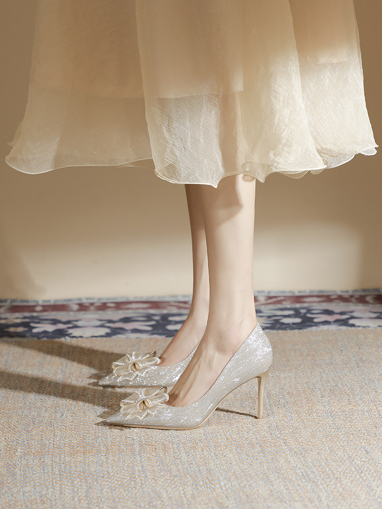 Весенняя обувь на высоком каблуке, золотые свадебные туфли с бантиком с заостренным носом, тренд сезона, цвета шампанского, для подружки невесты