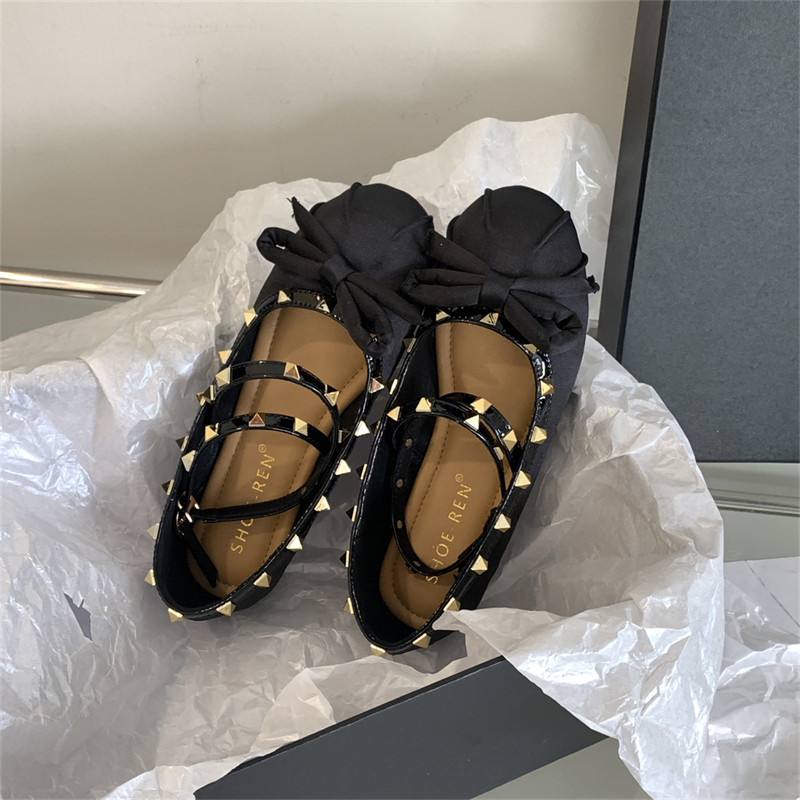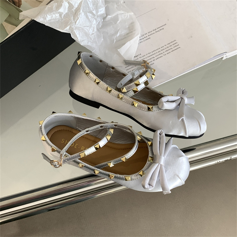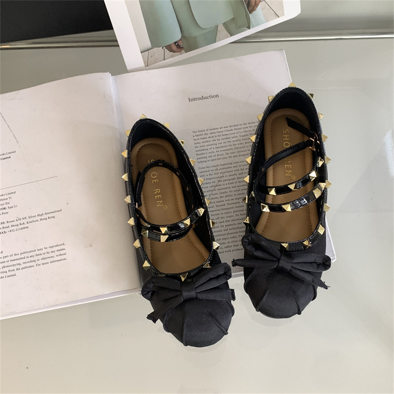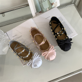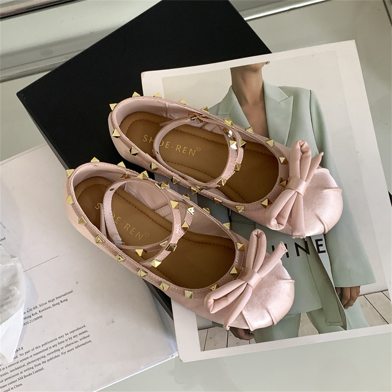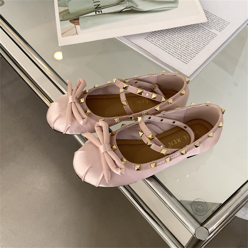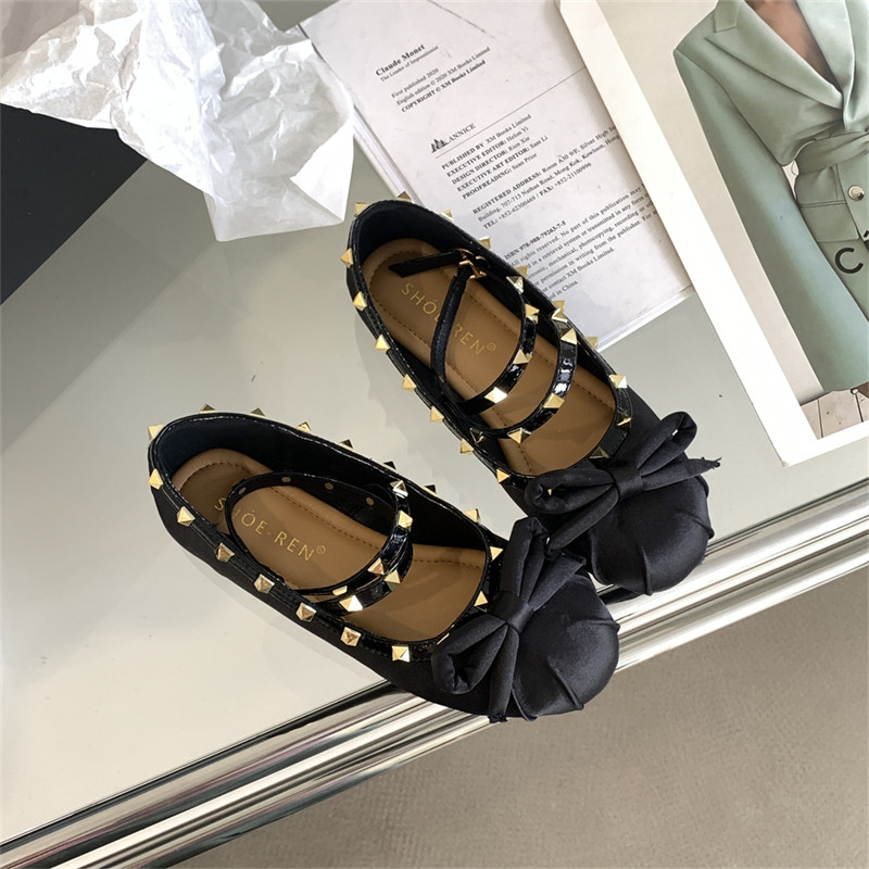 Женские балетки с перекрестной пряжкой, новинка 2026 года, атласные туфли на плоской подошве с бантом и заклепками в стиле Хепберн, туфли Мэри Джейн
