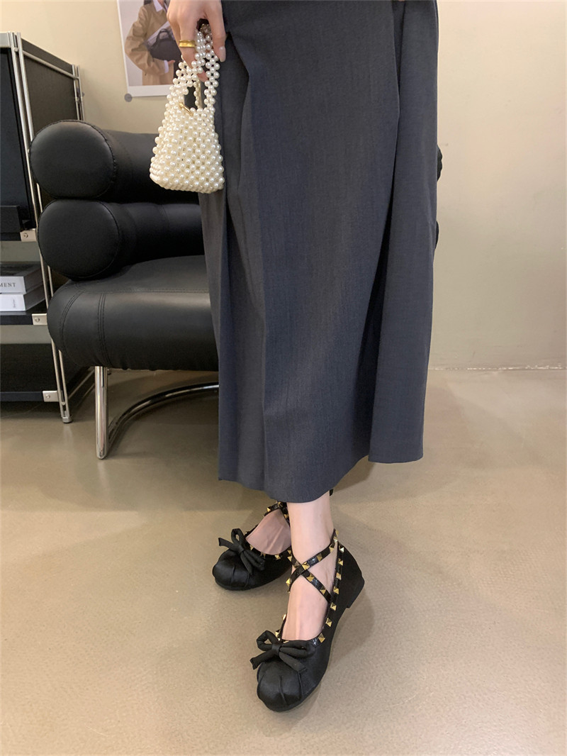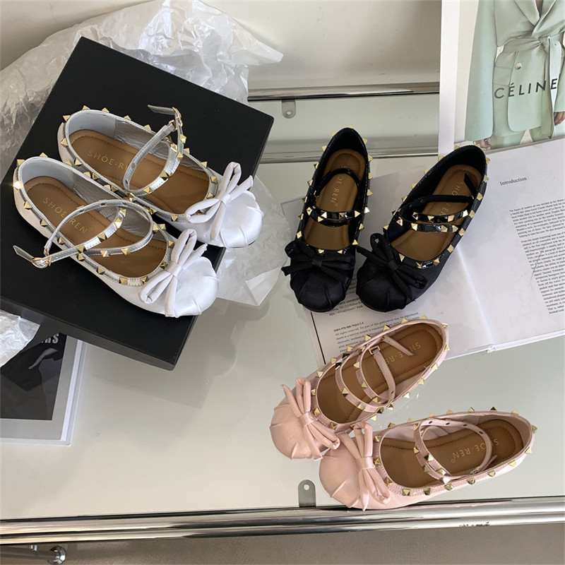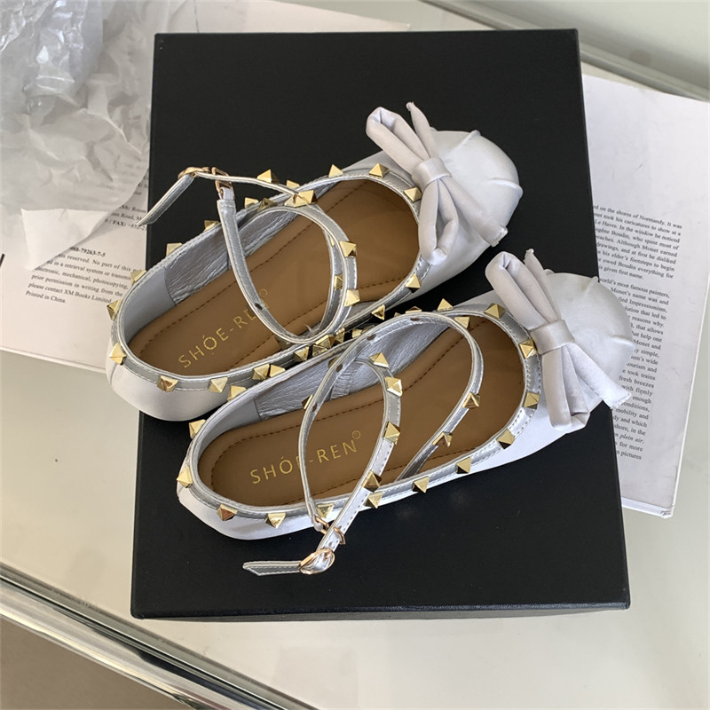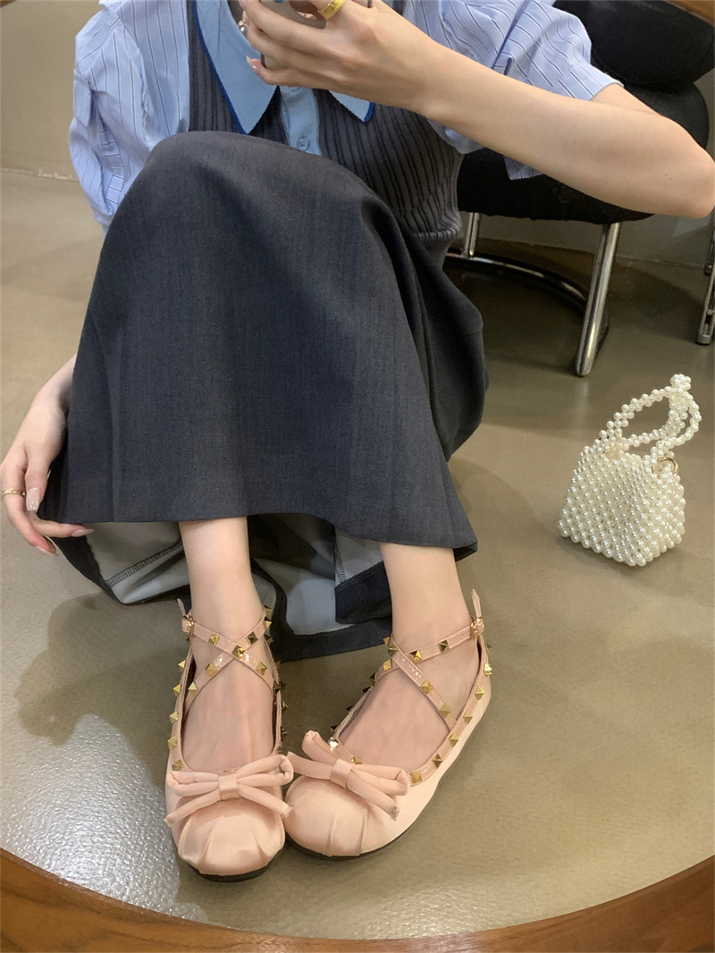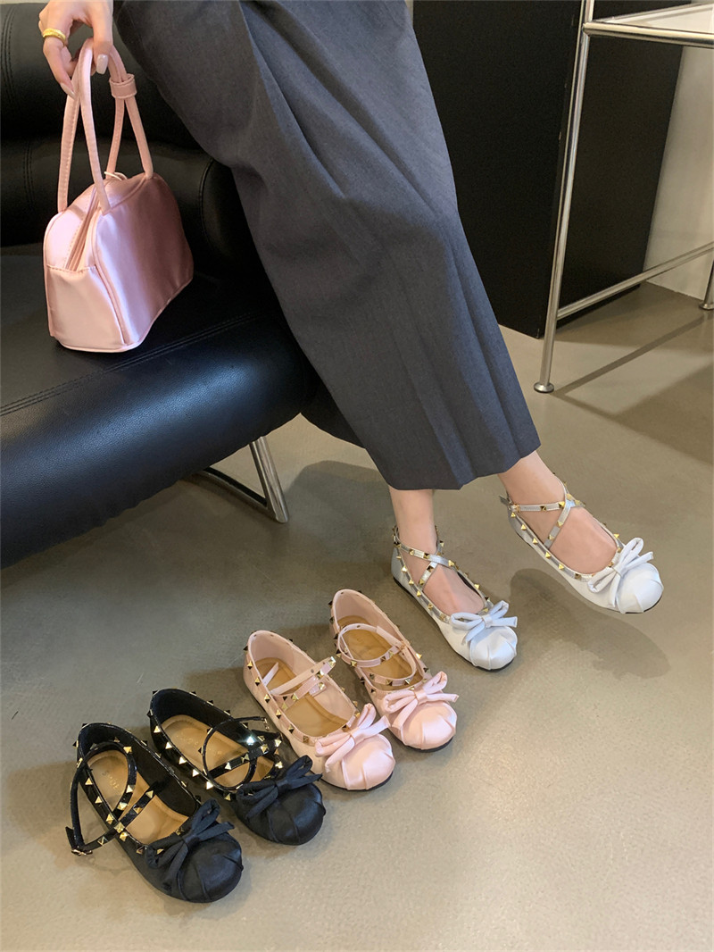 Женские балетки с перекрестной пряжкой, новинка 2026 года, атласные туфли на плоской подошве с бантом и заклепками в стиле Хепберн, туфли Мэри Джейн