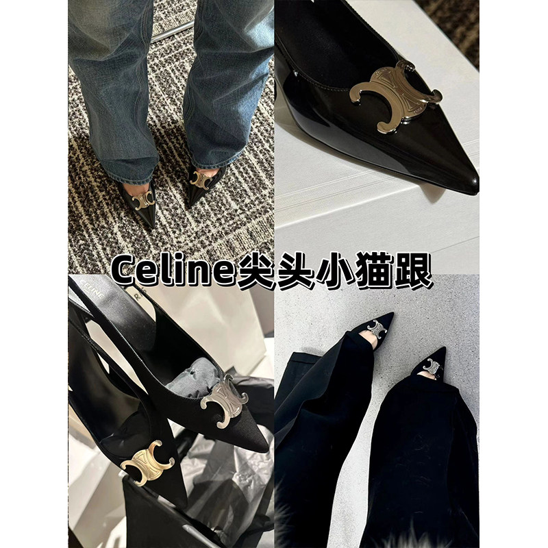 Spot Celine/Celin Cat Heel Высокие каблуки заостренные ремни для пальцев пальцев на сторону пустых тонких каблук