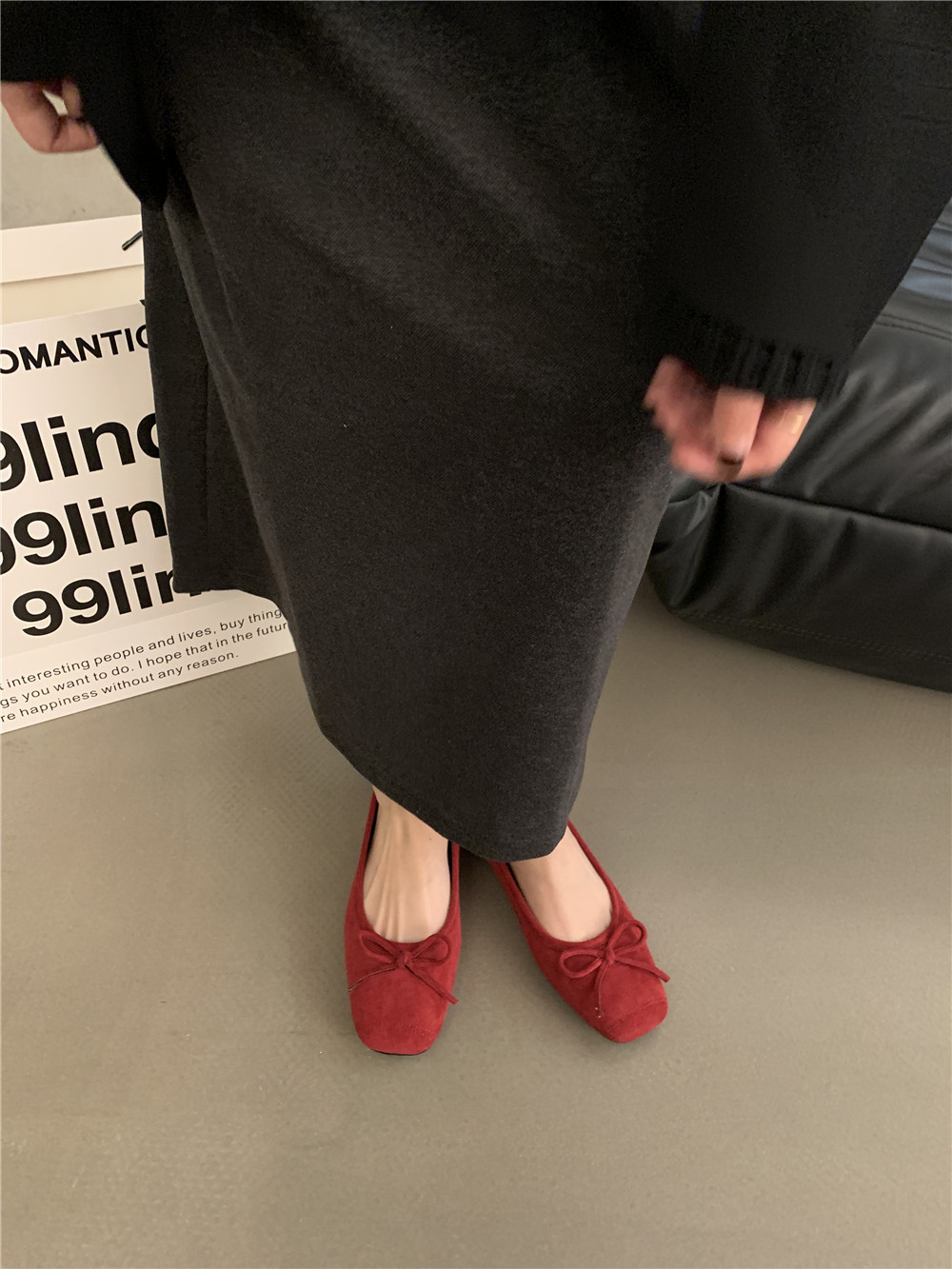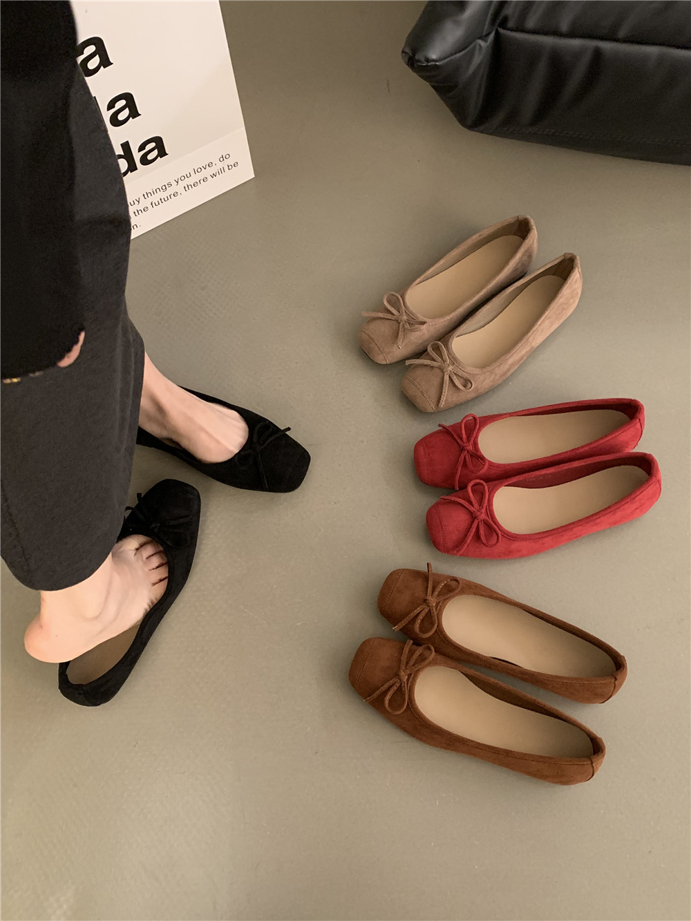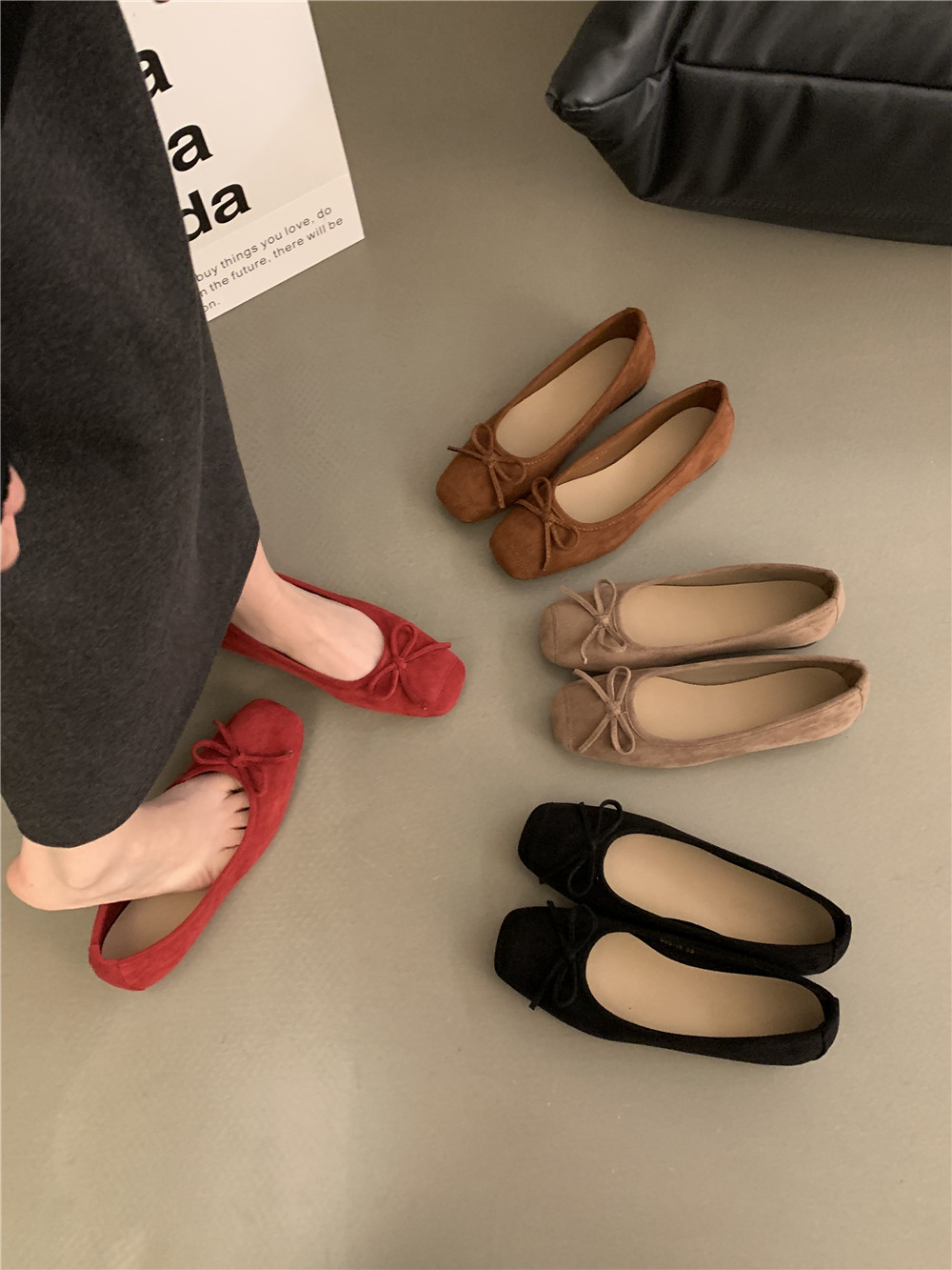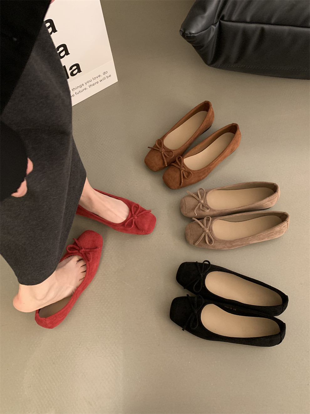 Плоская подошва обувь с бантиком, красные черные балетки, французский стиль