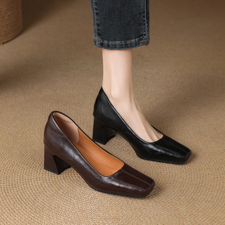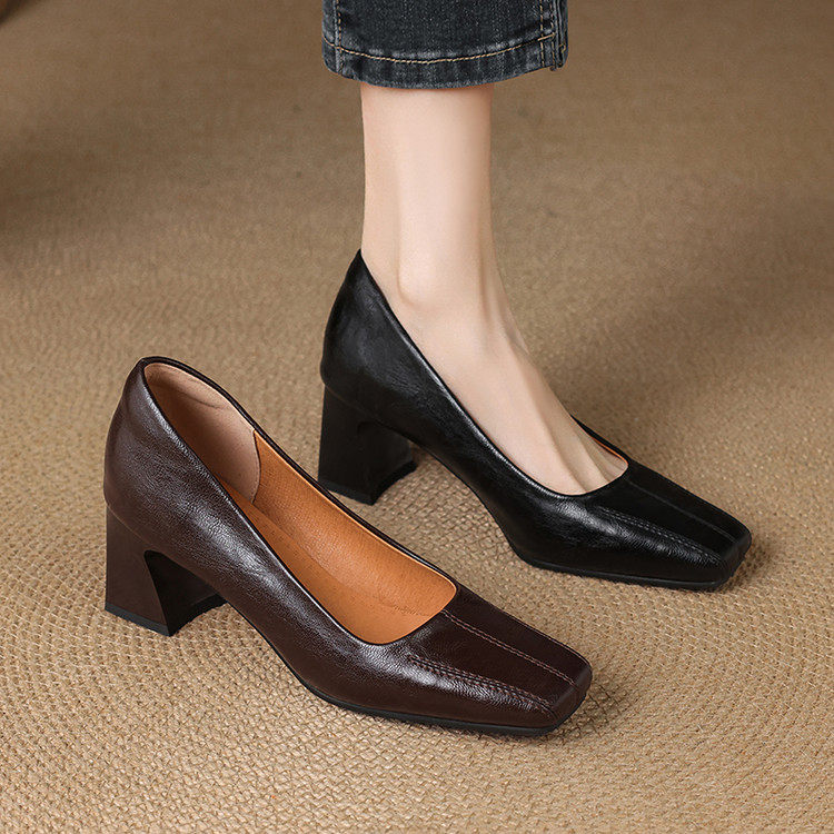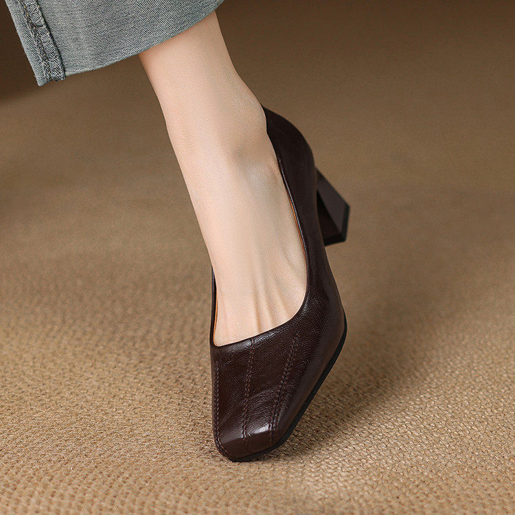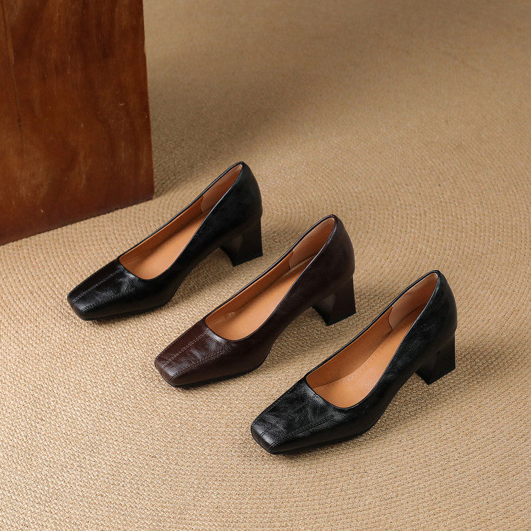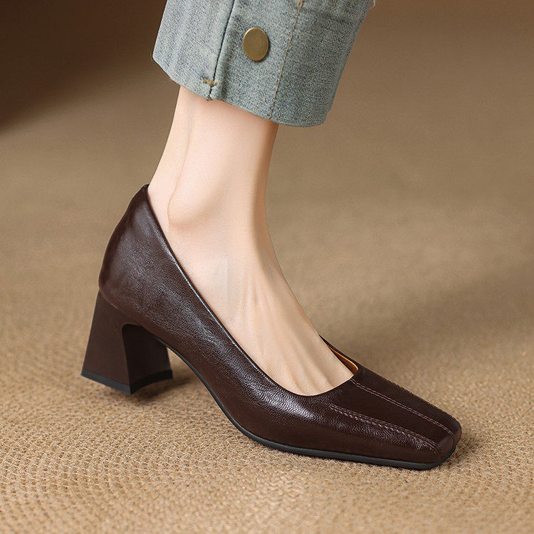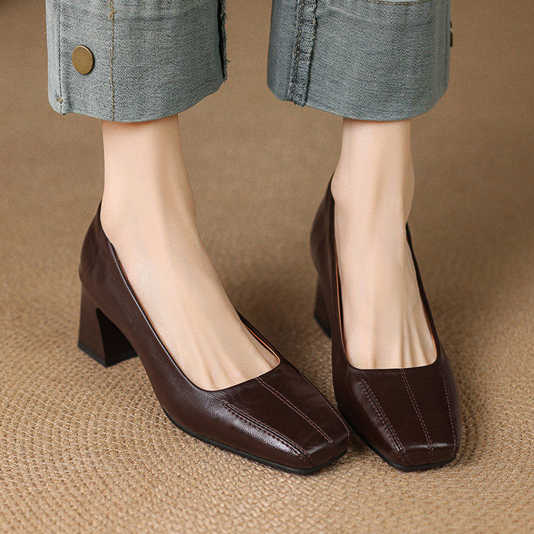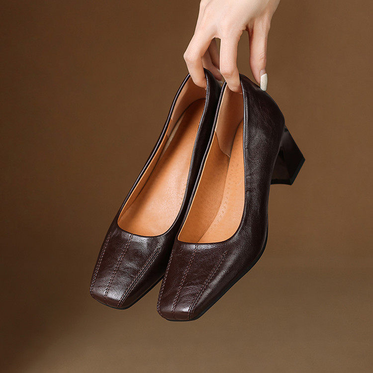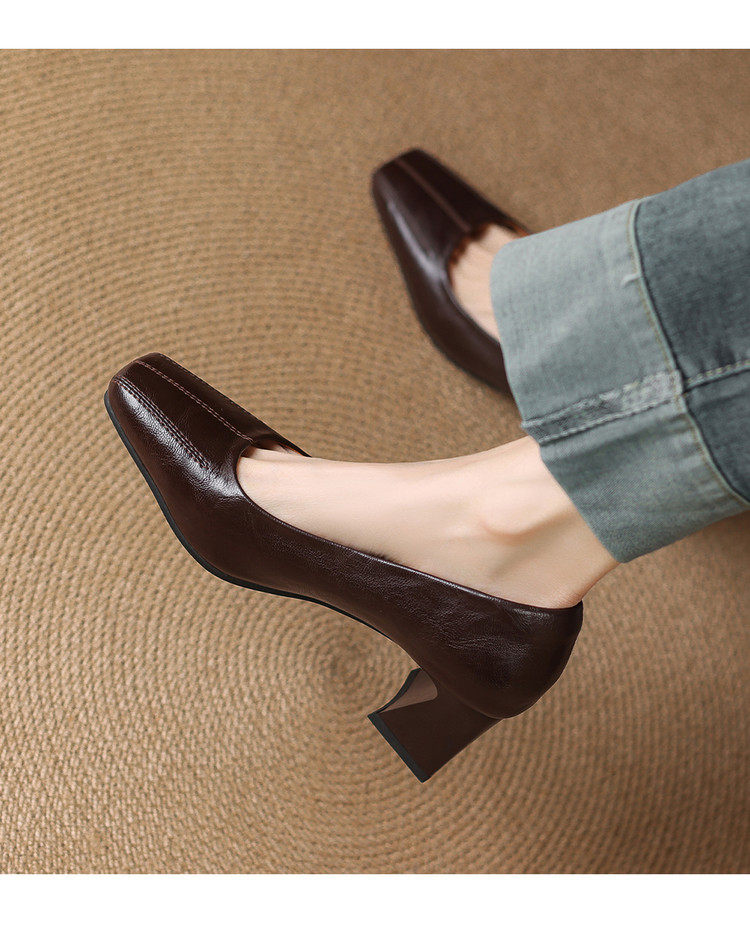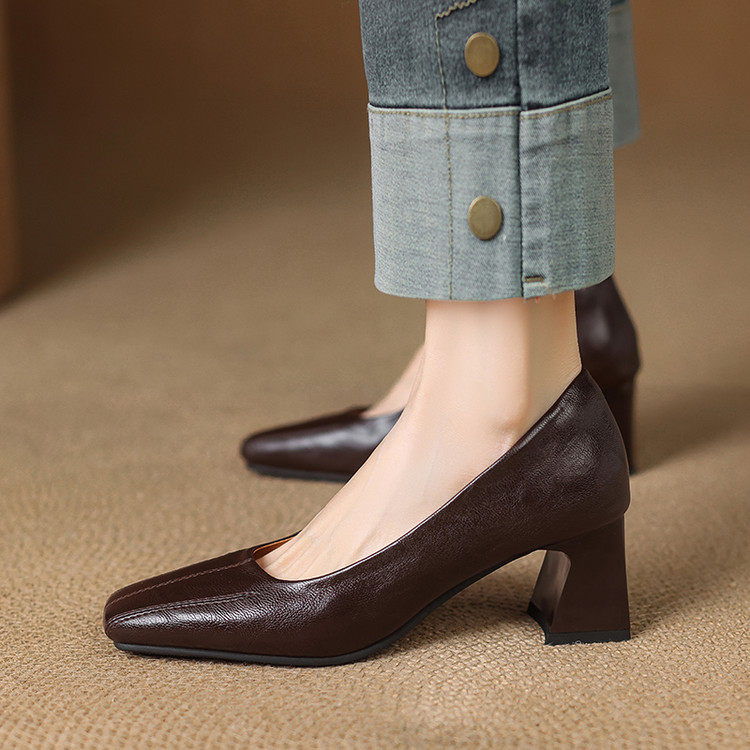 Французские средние каблуки коричневые маленькие кожаные туфли.