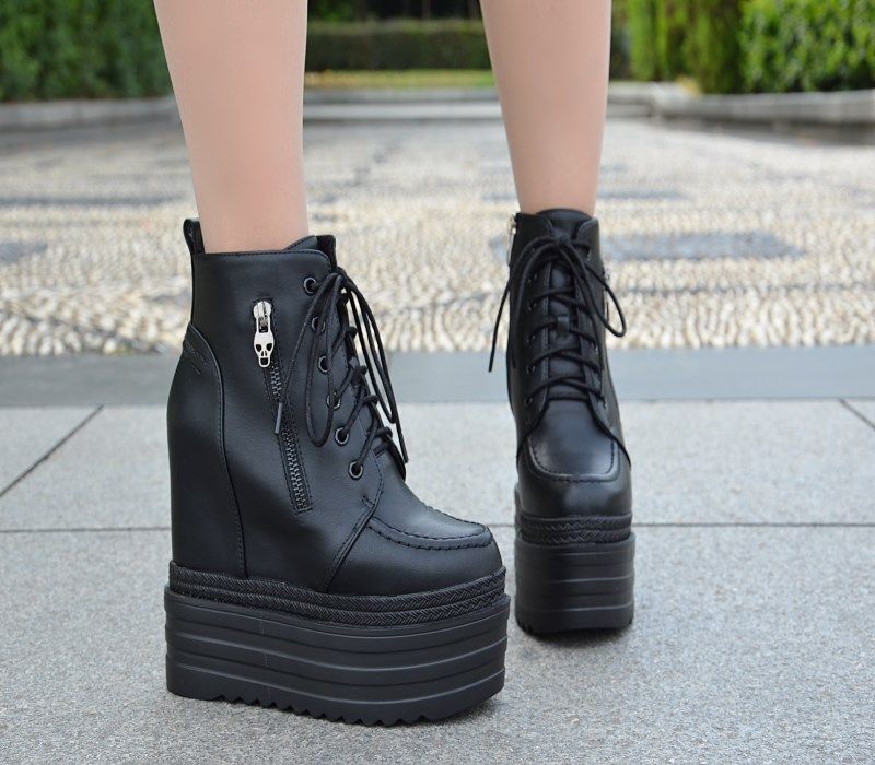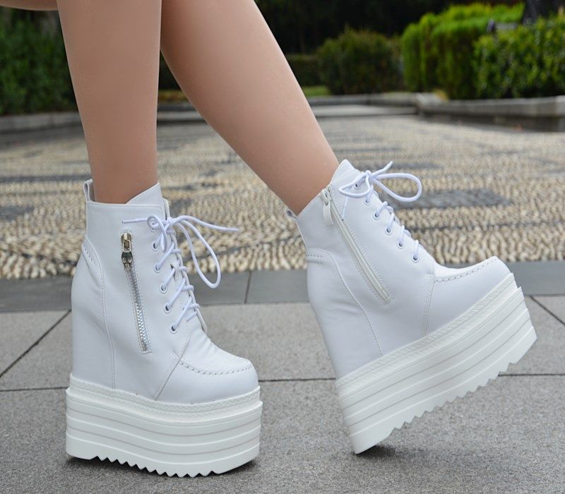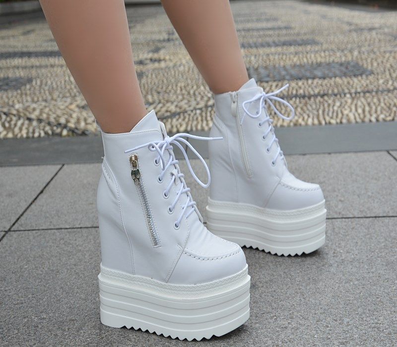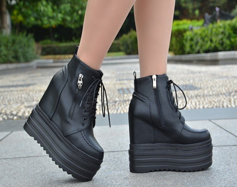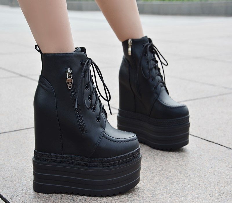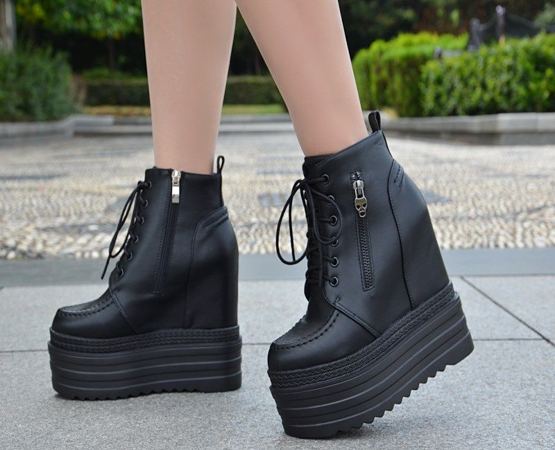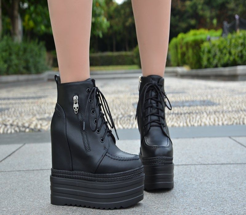 Осенние и зимние короткие сапоги на танкетке на внутренней высоте 16 см. Ботинки «мартенки» на толстой платформе и платформе с боковой молнией. Сапоги на сверхвысоком каблуке со шнуровкой.