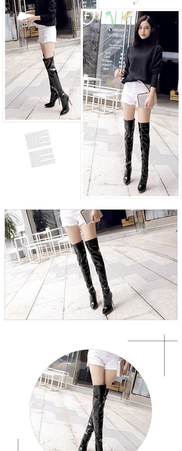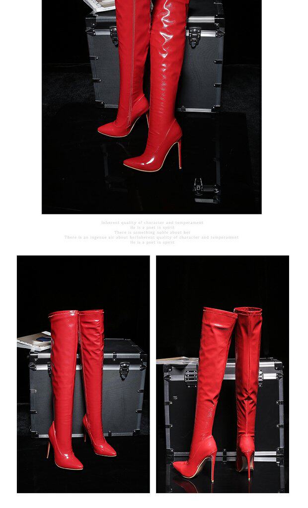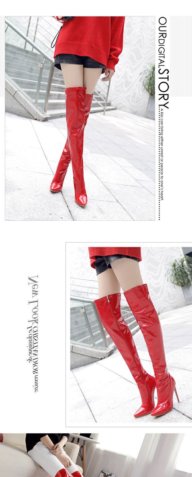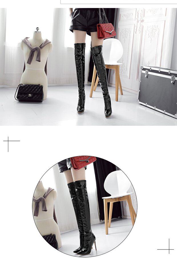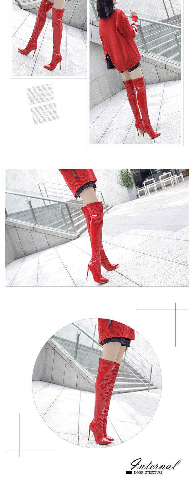 Новые сексуальные ботинки для танцев на пилоне на шпильке и очень высоком каблуке с острым носком и лакированной кожей с боковым подтягиванием, яркие кожаные сапоги выше колена, женские сапоги для ночного клуба