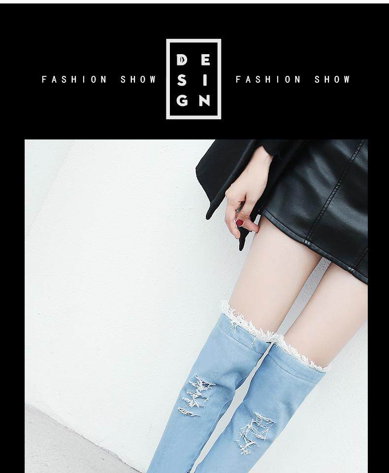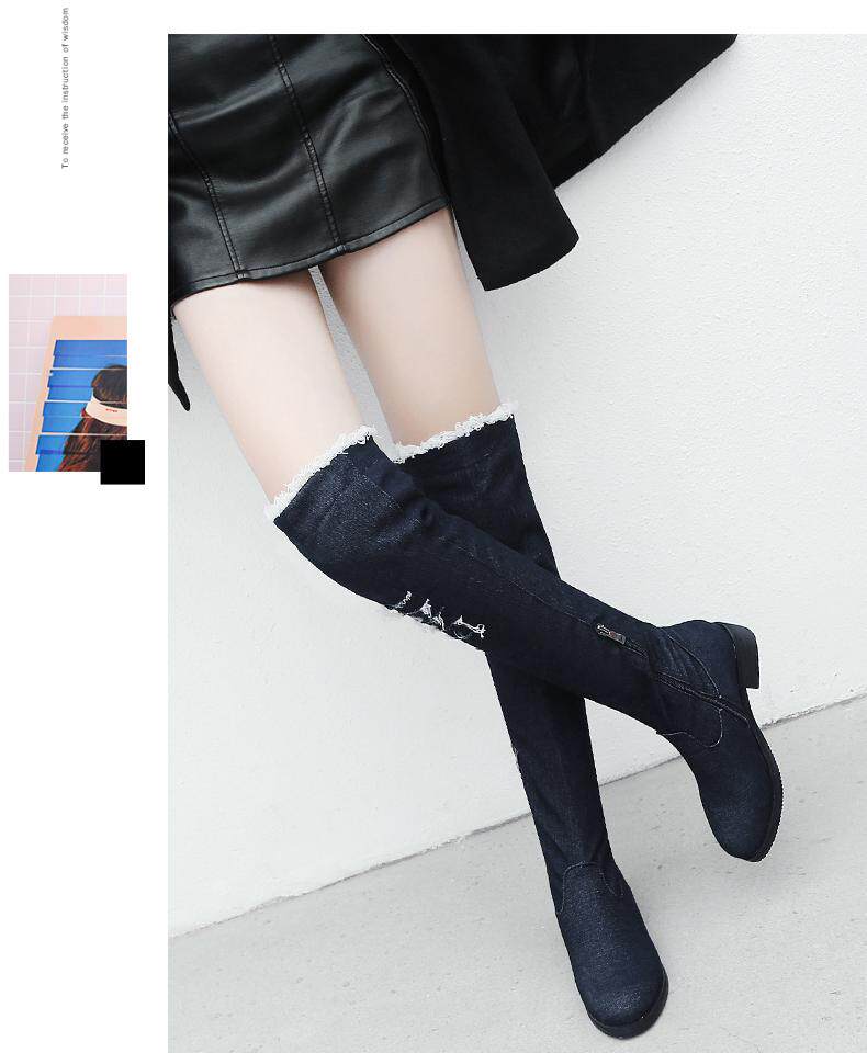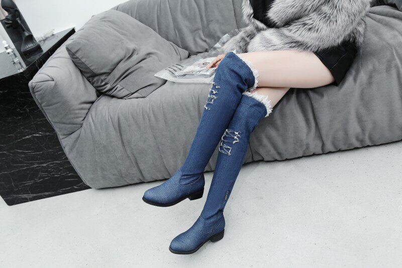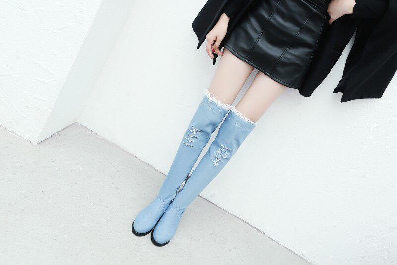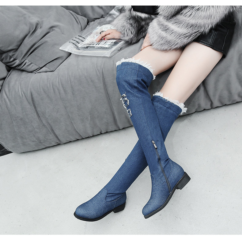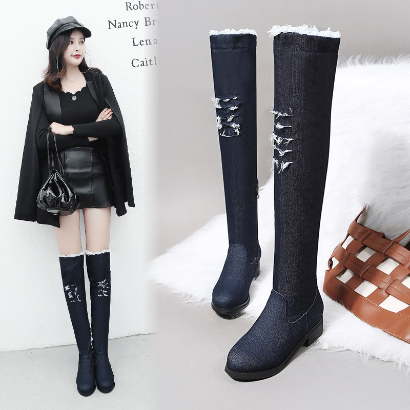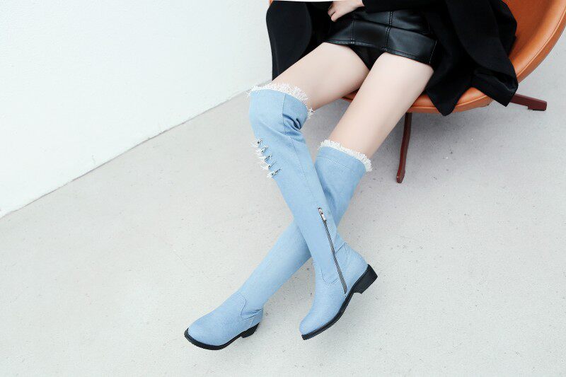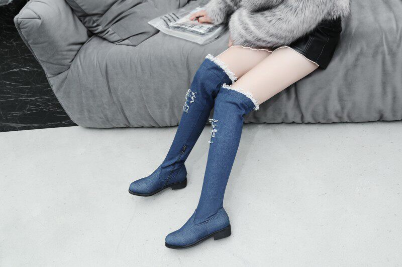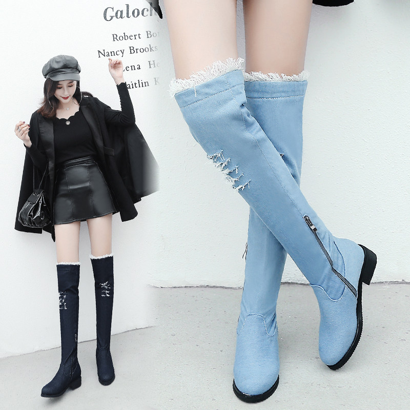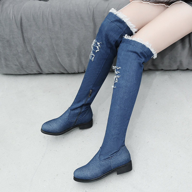 Демисезонные джинсовые эластичные высокие сапоги для школьников и студентов, европейский стиль