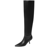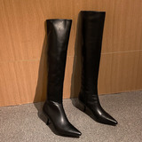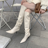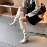 Высокие бежевые высокие сапоги с заостренным носом на высоком каблуке, по фигуре