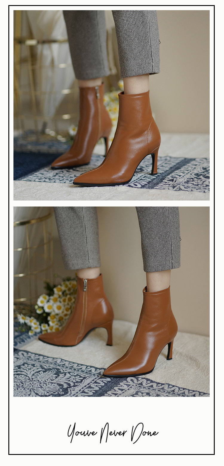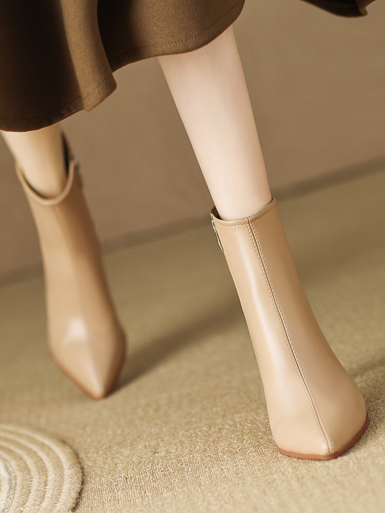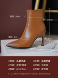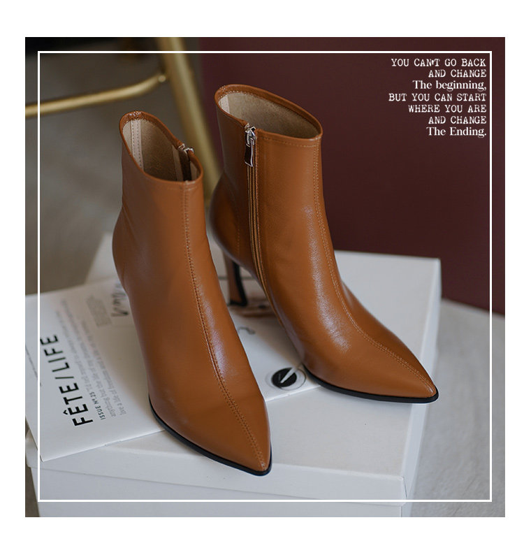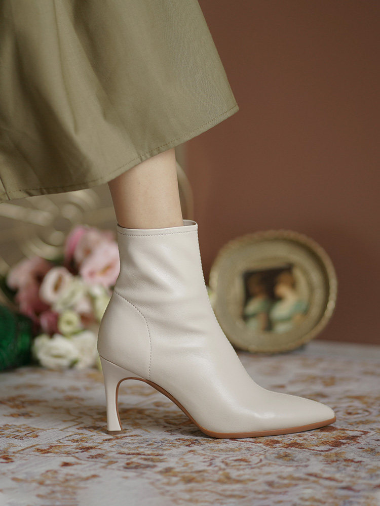 Белые короткие сапоги с заостренным носом на высоком каблуке, коричневые демисезонные ботильоны, зимние ботинки, французский стиль