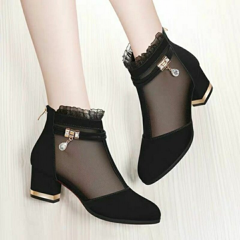 Сетчатые туфли на высоком каблуке, демисезонные черные ботинки