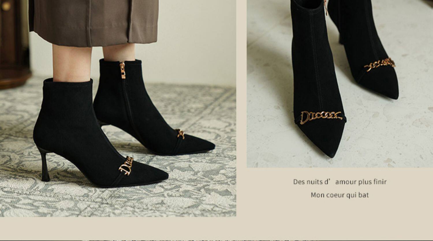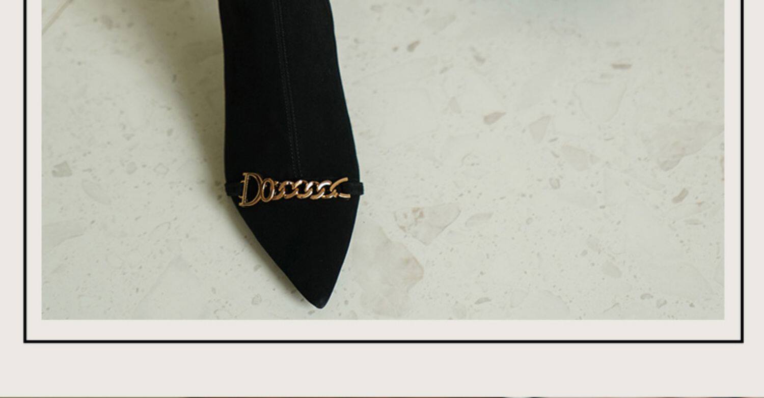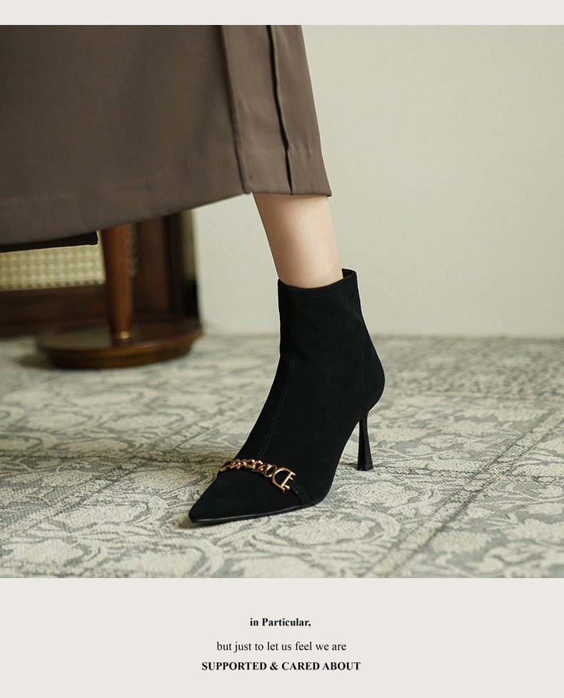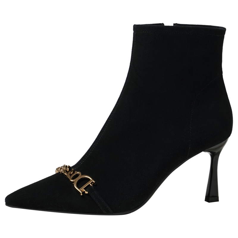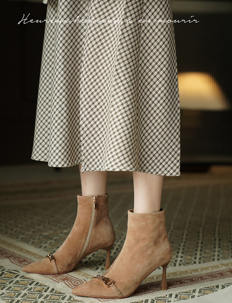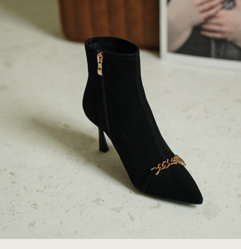 Короткие сапоги с заостренным носом на высоком каблуке, металлическая матовая цепь, нюдовые ботильоны, осенние, французский стиль