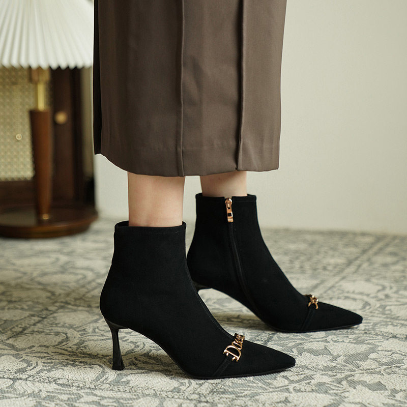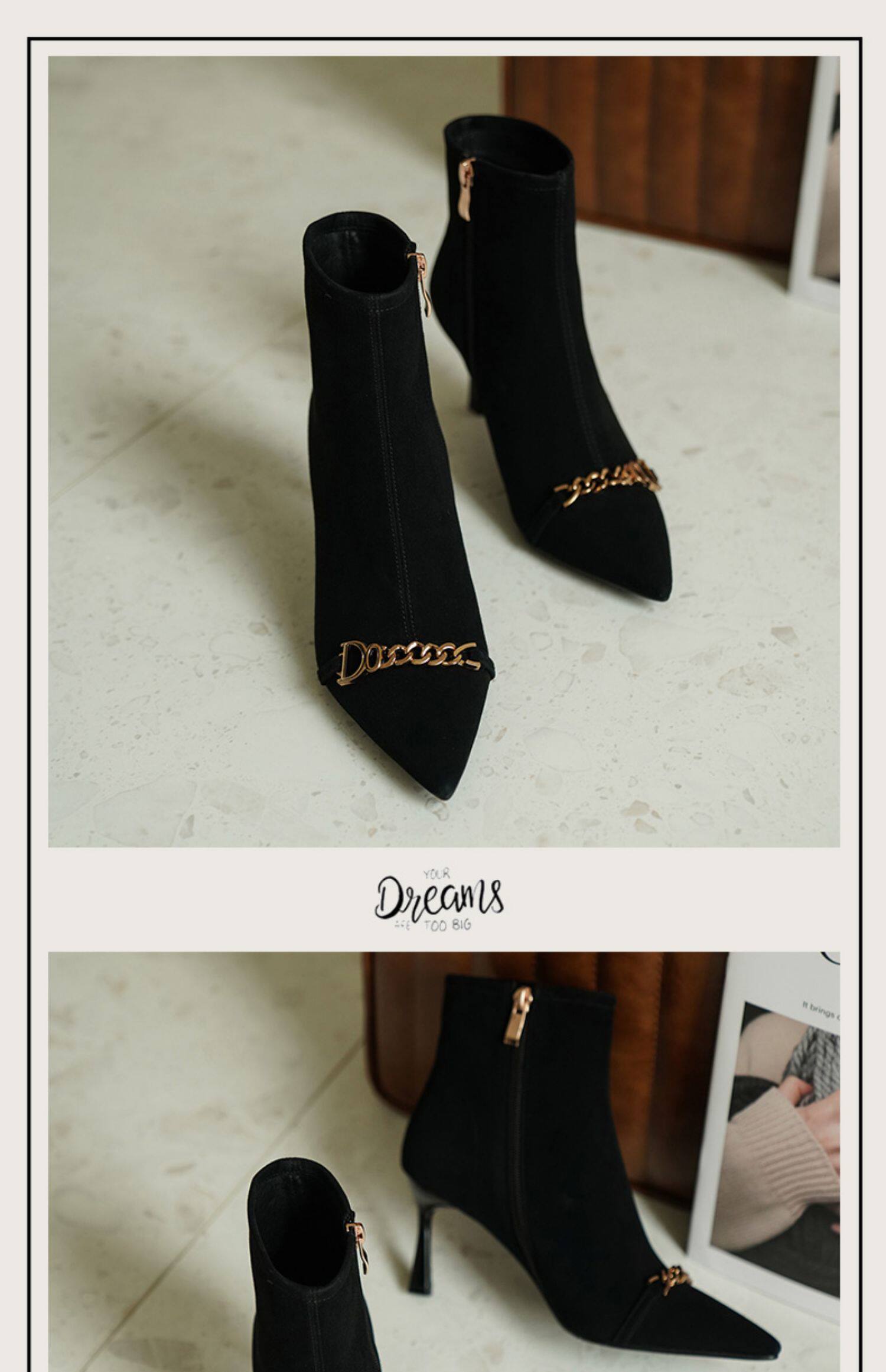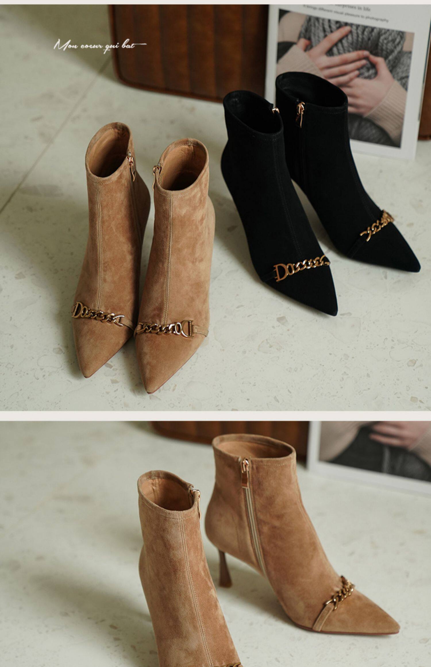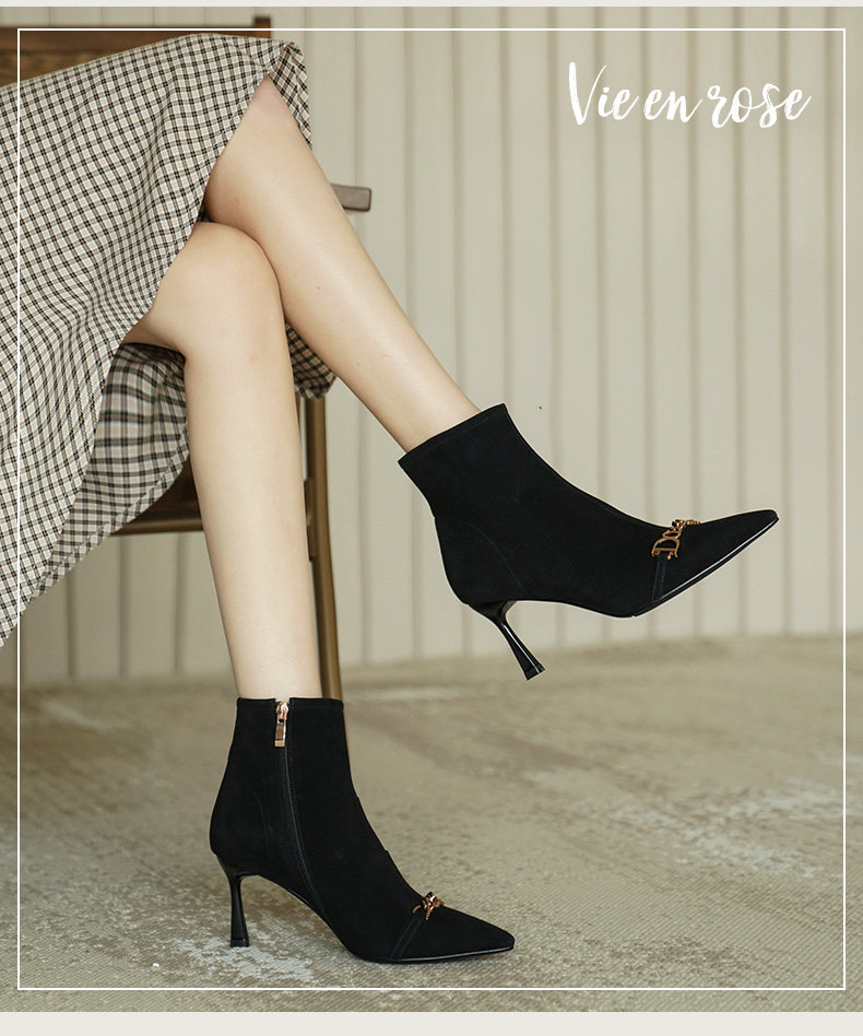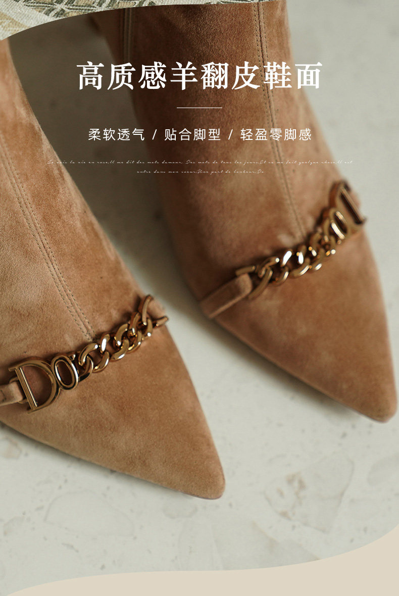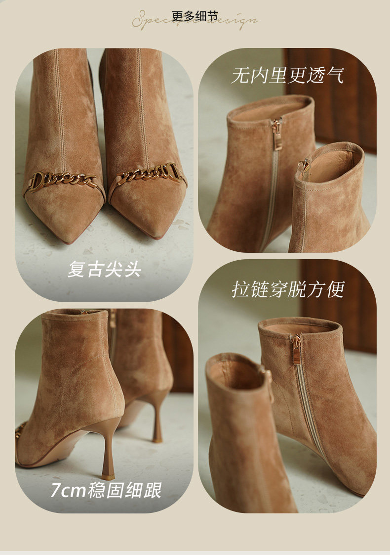 Короткие сапоги с заостренным носом на высоком каблуке, металлическая матовая цепь, нюдовые ботильоны, осенние, французский стиль