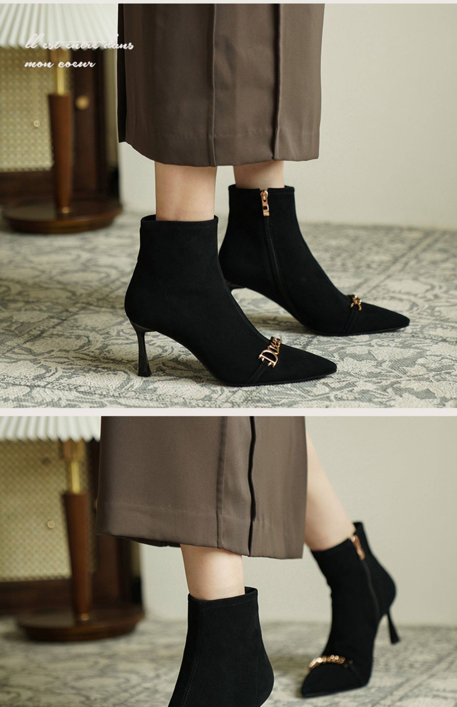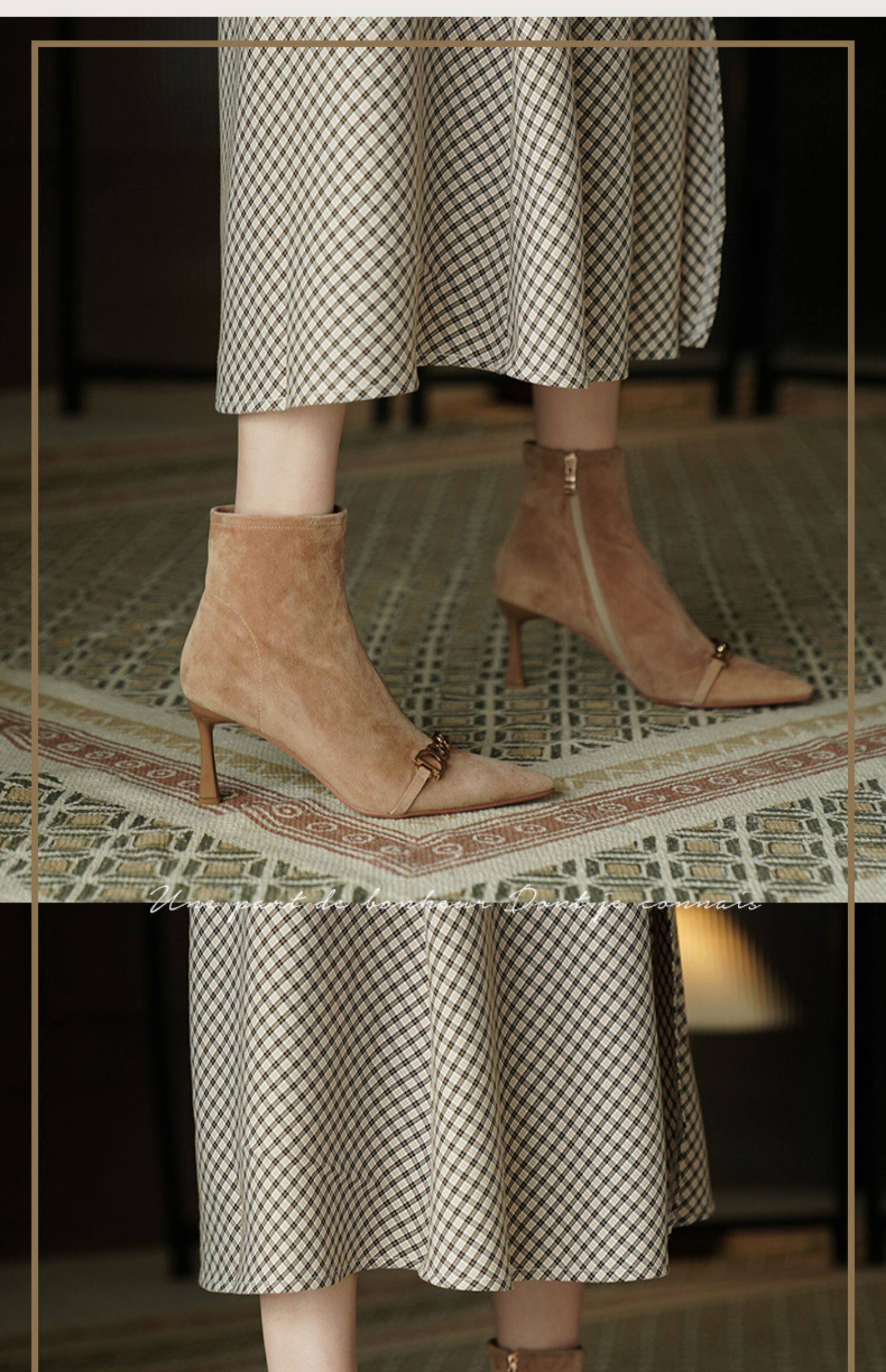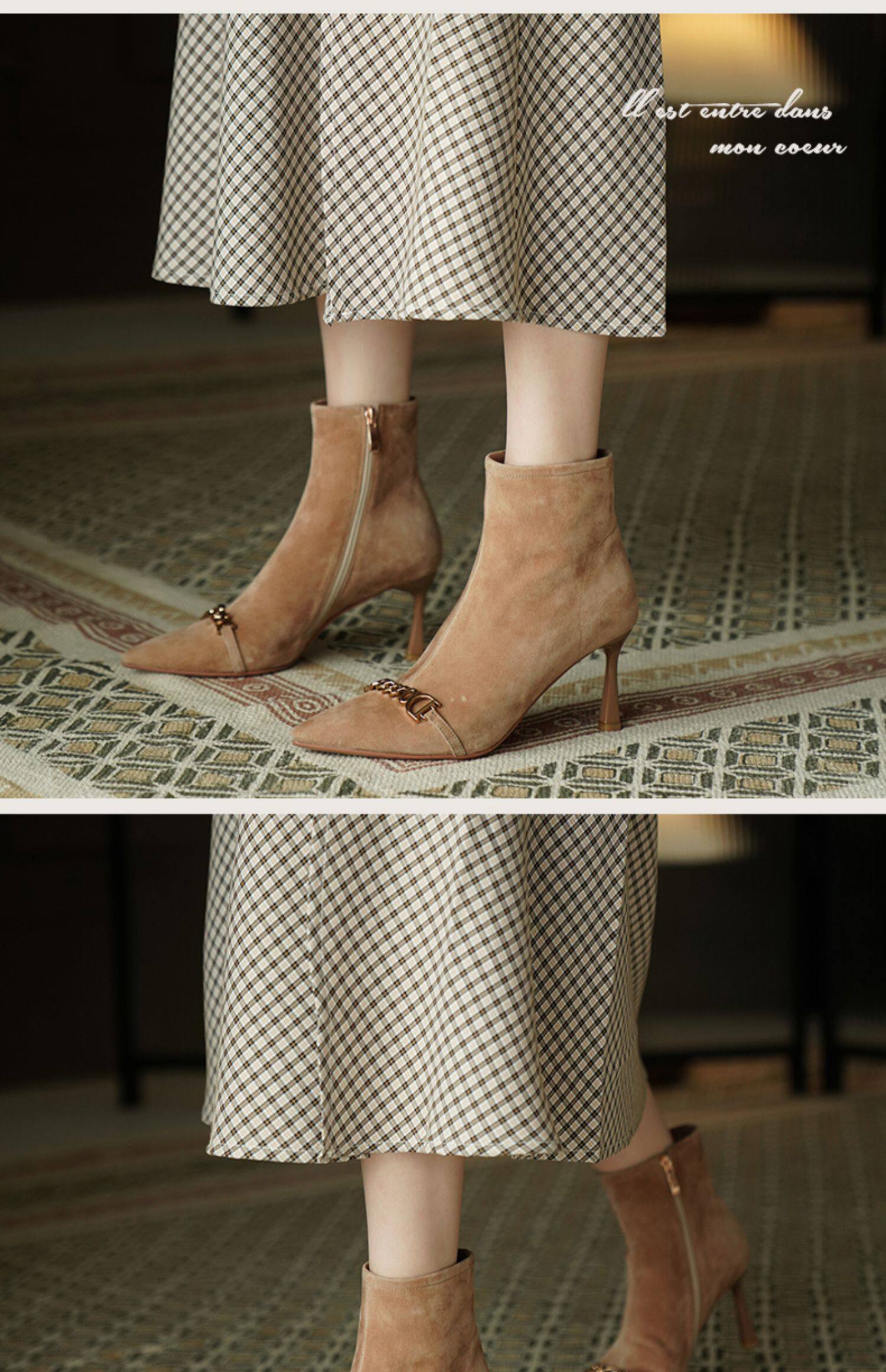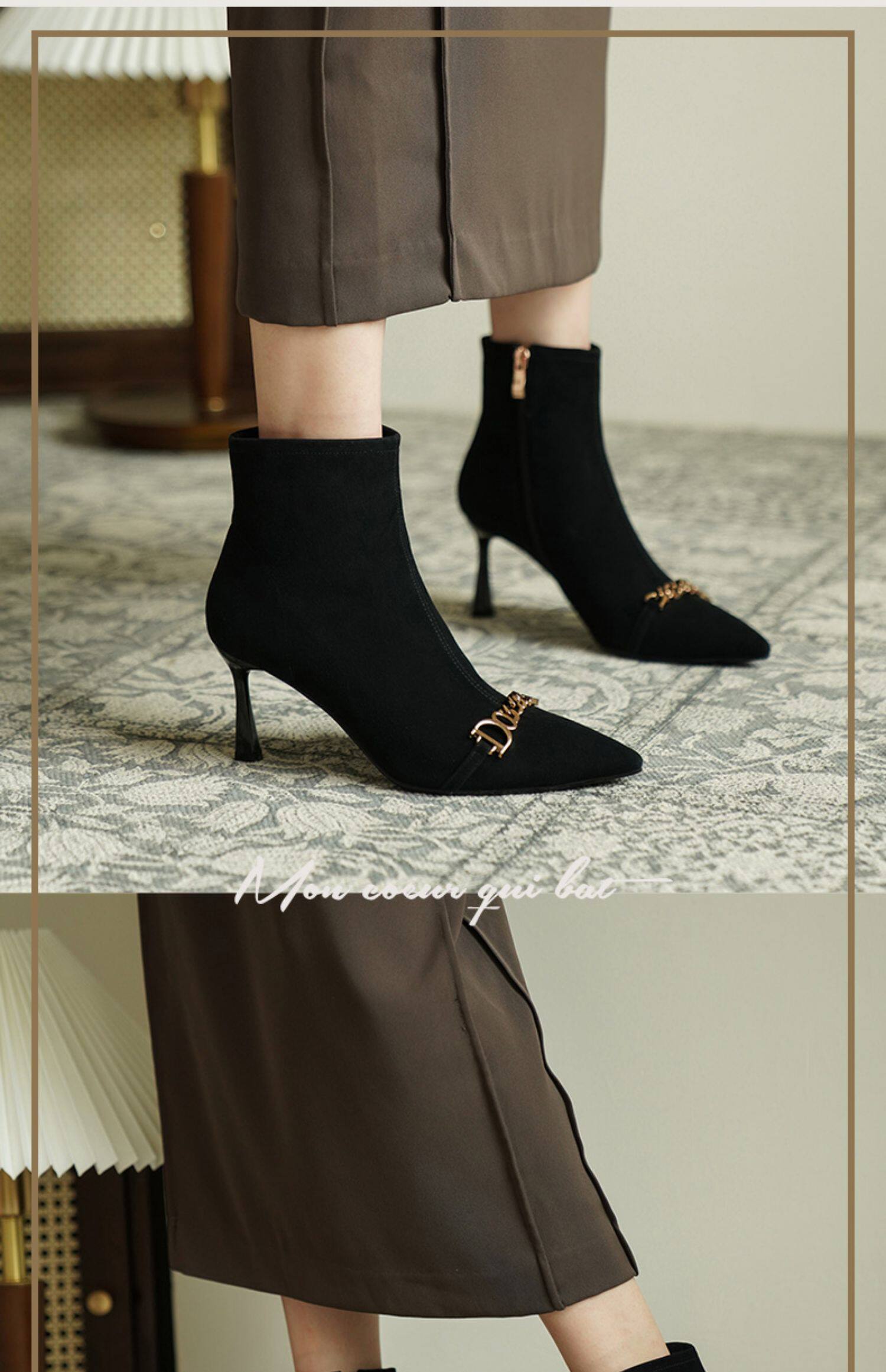 Короткие сапоги с заостренным носом на высоком каблуке, металлическая матовая цепь, нюдовые ботильоны, осенние, французский стиль