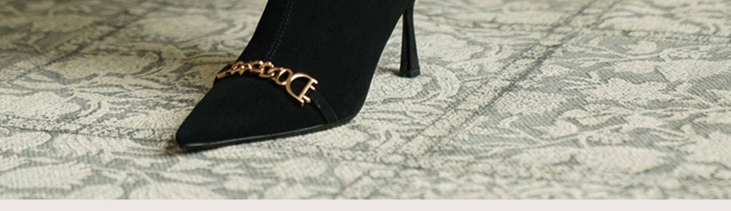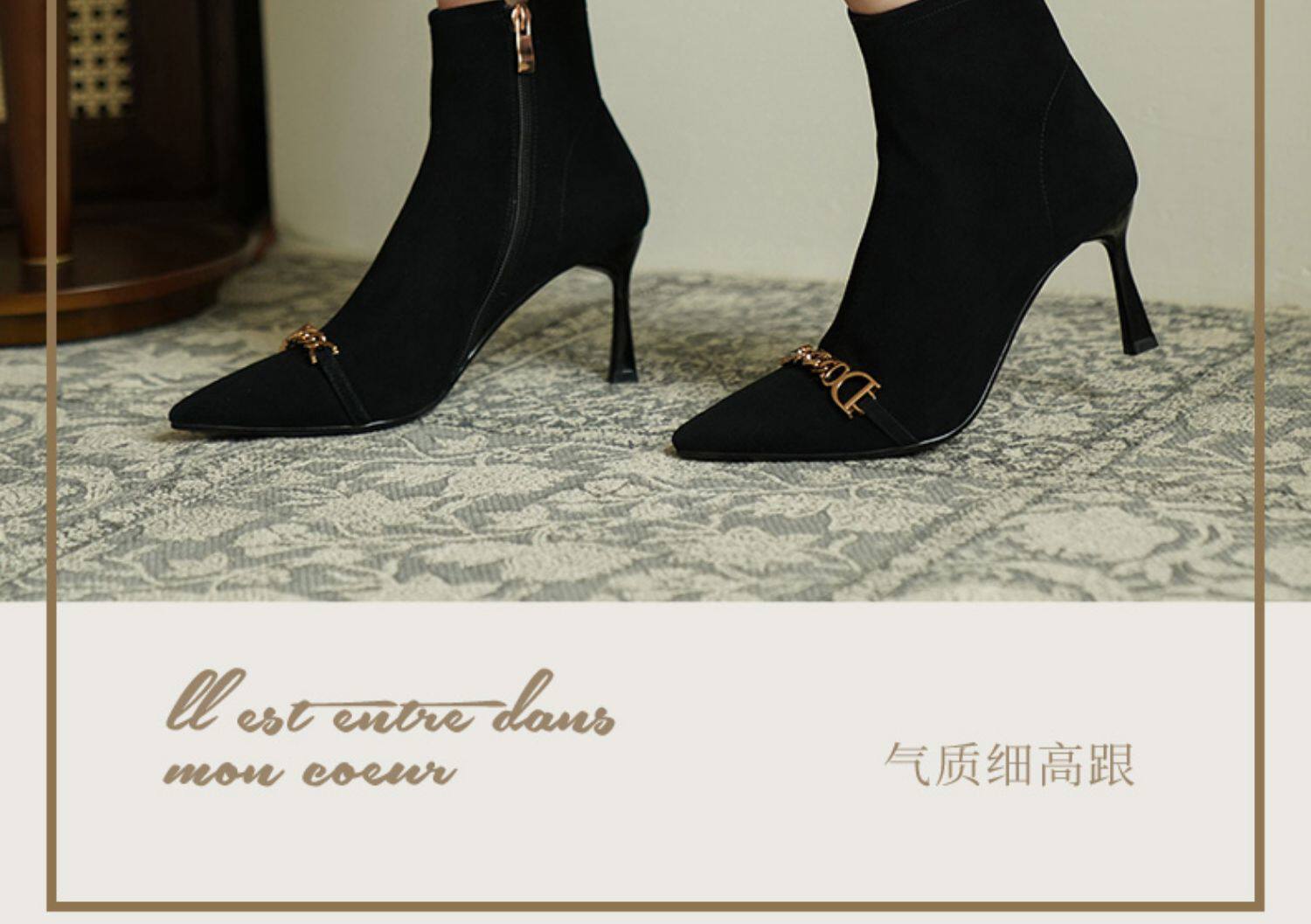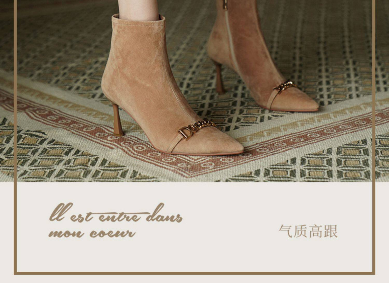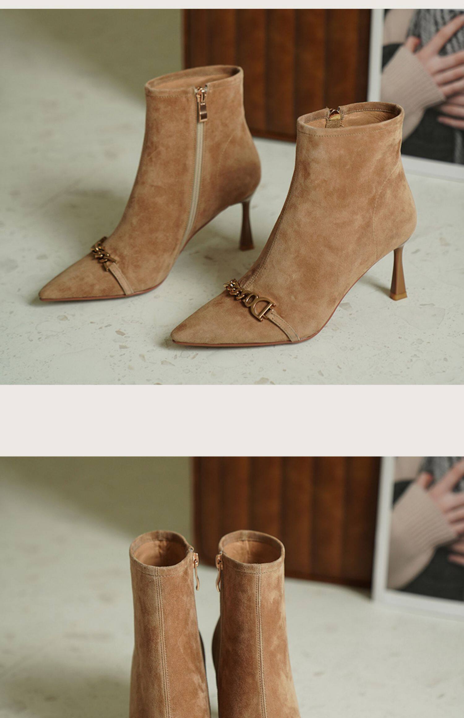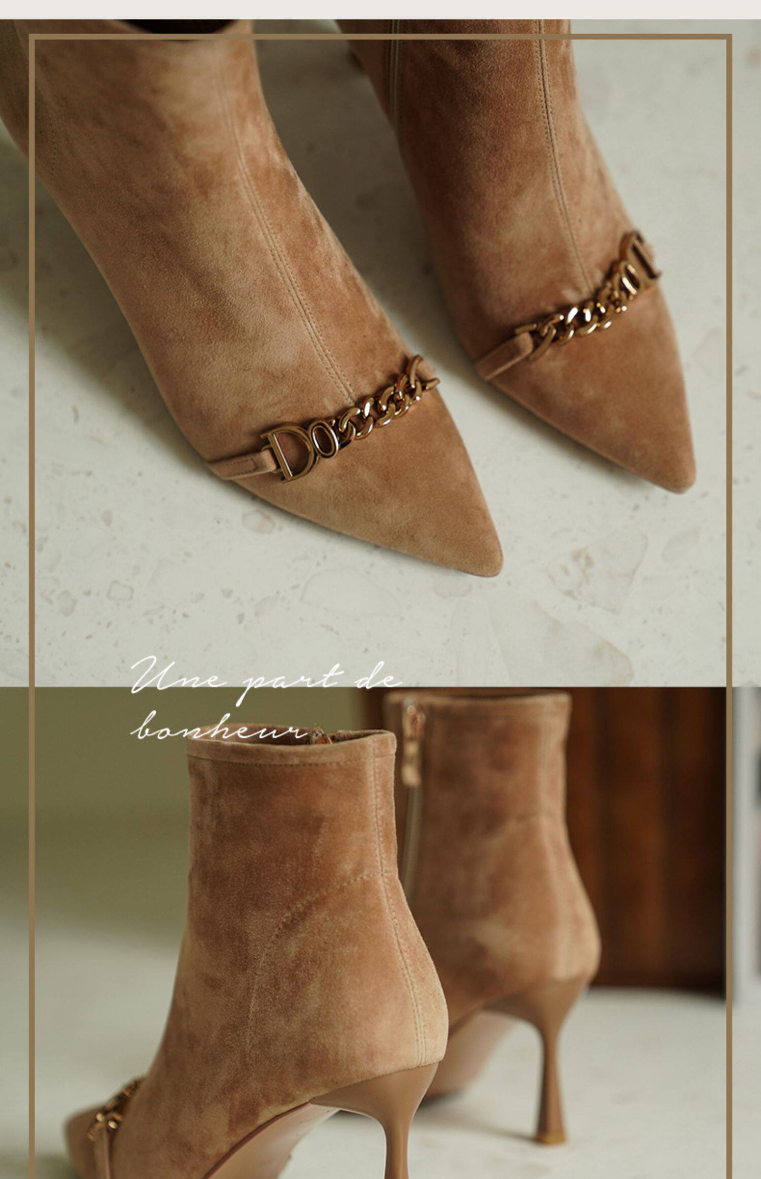 Короткие сапоги с заостренным носом на высоком каблуке, металлическая матовая цепь, нюдовые ботильоны, осенние, французский стиль